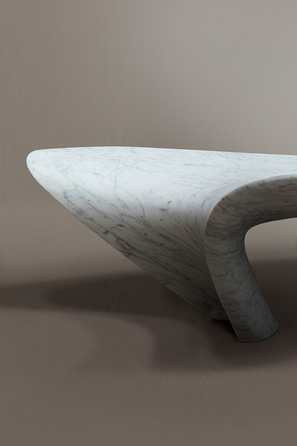 为Neutra设计的侵蚀系列,通过一组作品探讨材料性、地质学与雕塑形态,在符合人体工学的前提下,将雕塑表达融入设计之中。MINERA餐桌与BRANCH控制台桌于2024年奠定了该系列的基础,通过对天然石材的表现性运用——以侵蚀与地质过程为灵感,从整块大理石中雕刻出流动的形态,探索天然材料的雕塑潜力。在此基础上,系列发展为更广泛的设计对话,并在 2026 年米兰国际家具展上推出新作品,进一步拓展了材料语言与空间感知。STRATA长凳、DELTA咖啡桌、AER低椅、LEDGE边几、VEIL地毯以及DRIFT餐具延续了ZHA对侵蚀的研究,将自然过程转译为功能性设计。