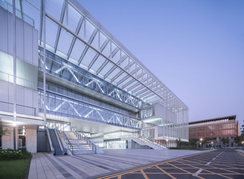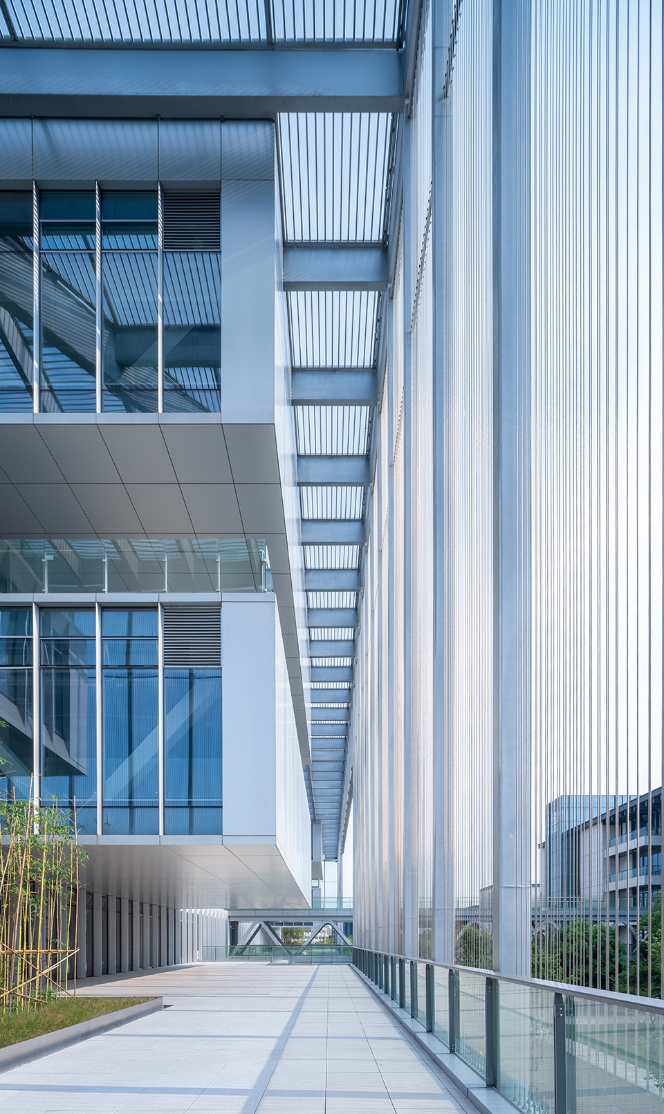外立面采用双层表皮:外层半透明金属网在遮阳与视线过渡之外,以抽象方式表达信息时代“滤波/织网”的意象;内层由大面落地玻璃与模块化铝板构成清晰界面。两层表皮叠合使建筑远观轻盈统一,近人尺度又呈现细密层次与可读的建构逻辑。