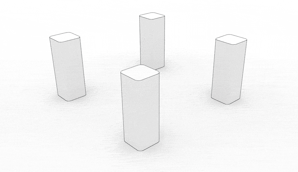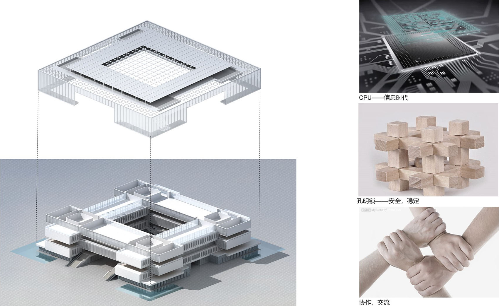 建筑主体由多个网络实验室单元构成。针对大空间、高自由度、低结构干扰的使用需求,设计将功能模块化为若干“方形盒子”,并以逐层搭接的方式组织体量。体块在竖向旋转交错,通过穿插与架空形成类似“孔明锁”的井格构成:既借喻互联网“多边交织、协作共生”的结构逻辑,也为园区建立清晰的识别性。