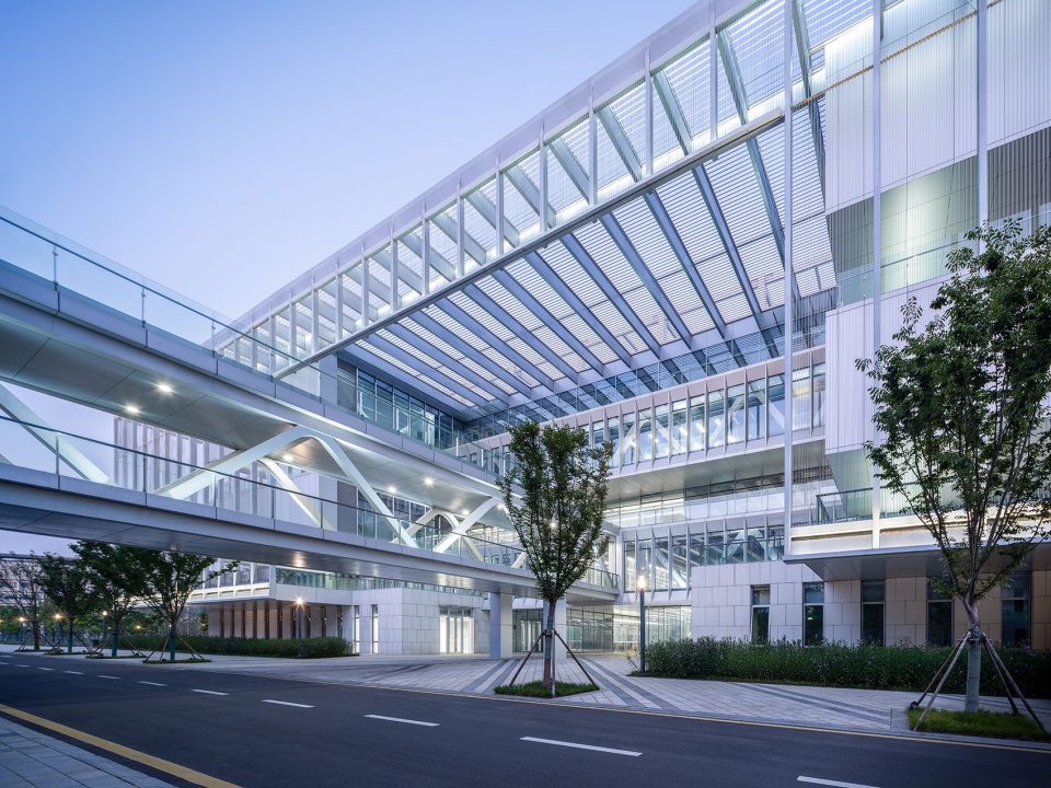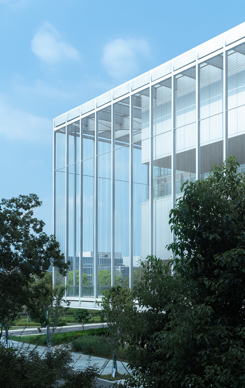 The facade adopts a double skin. The outer semi-transparent metal mesh offers shading and visual moderation, symbolizing filtering and networking in the digital age. The inner layer consists of full-height glass and modular aluminum panels. Layered skins create a light, unified overall appearance, with delicate textures and clear structural logic at close range.