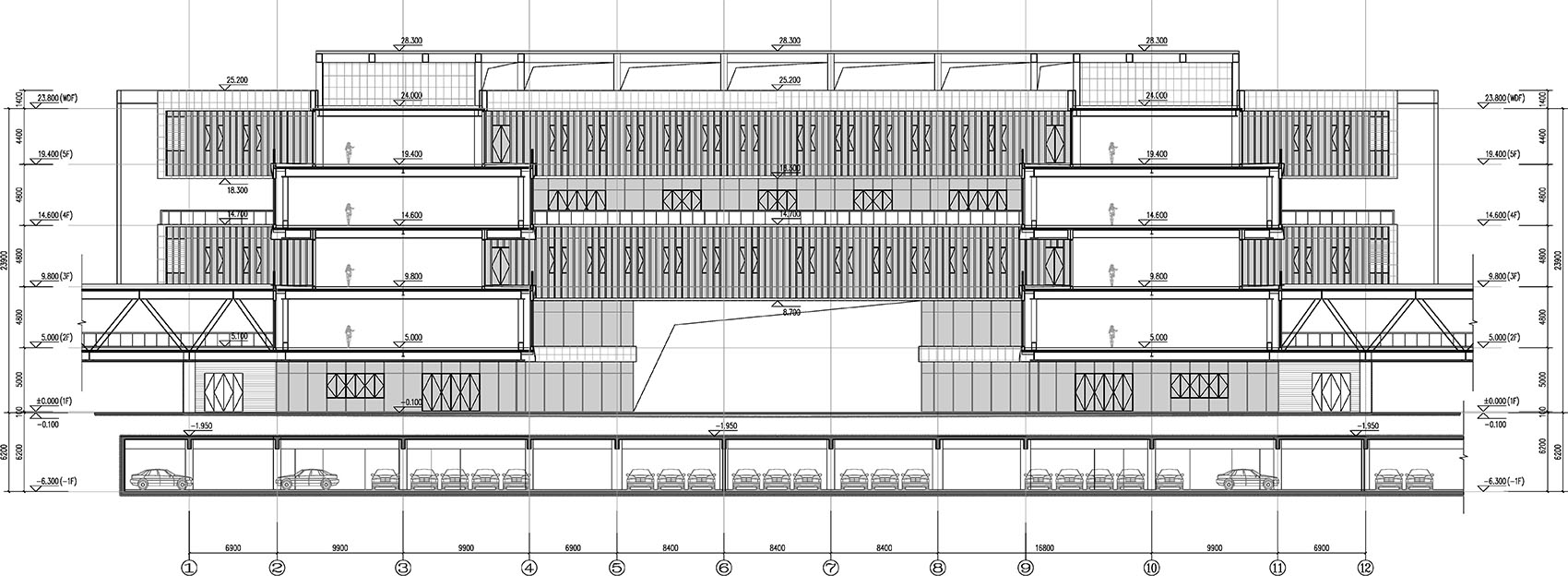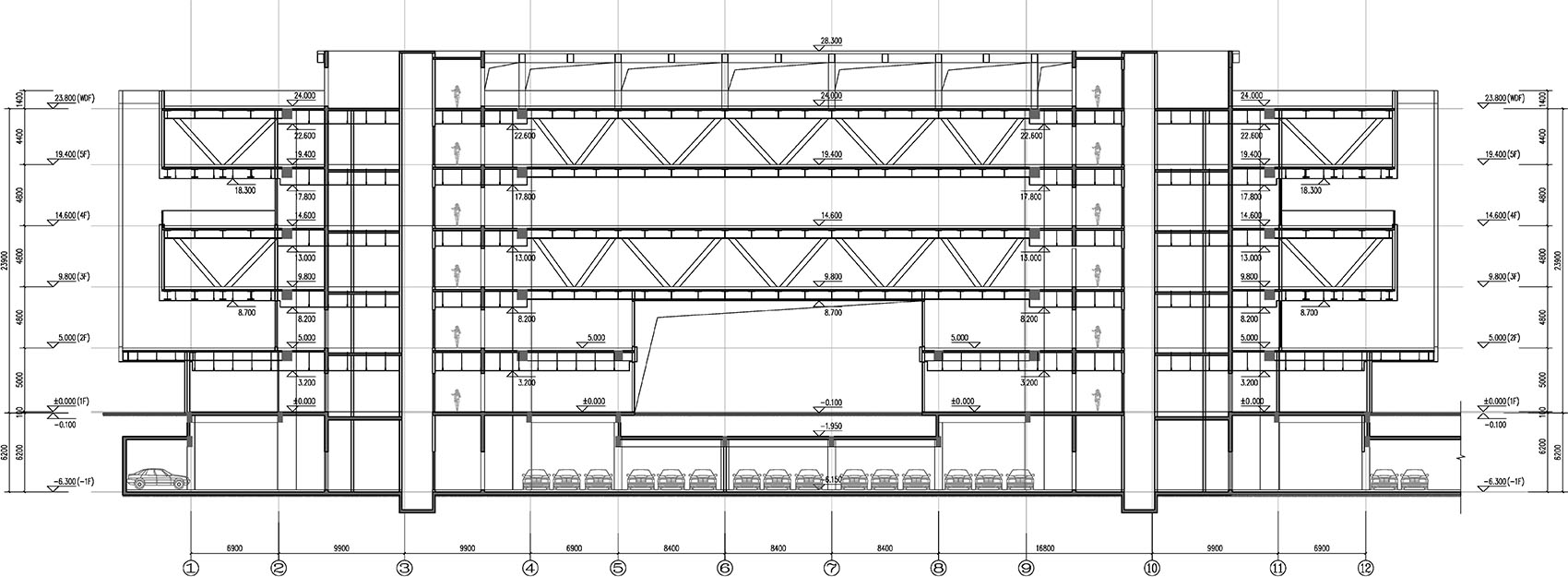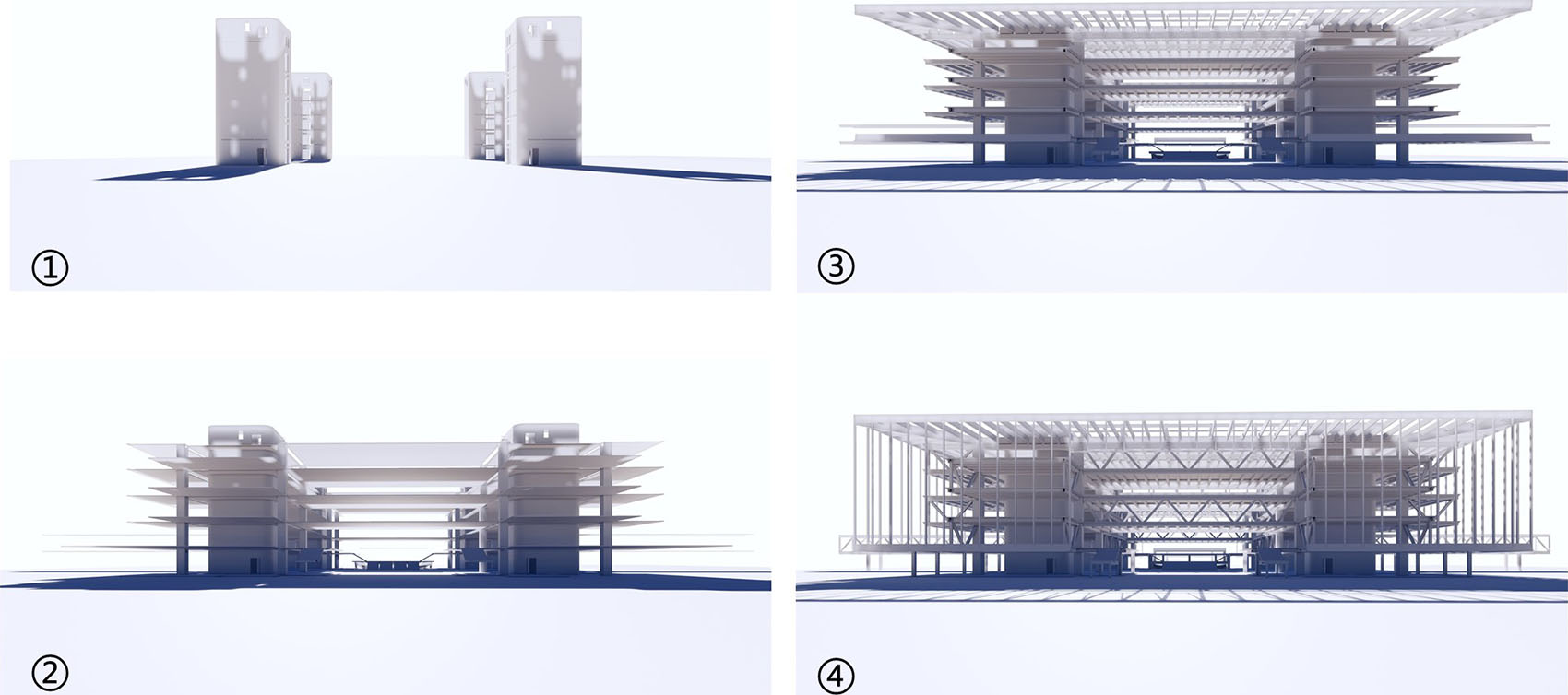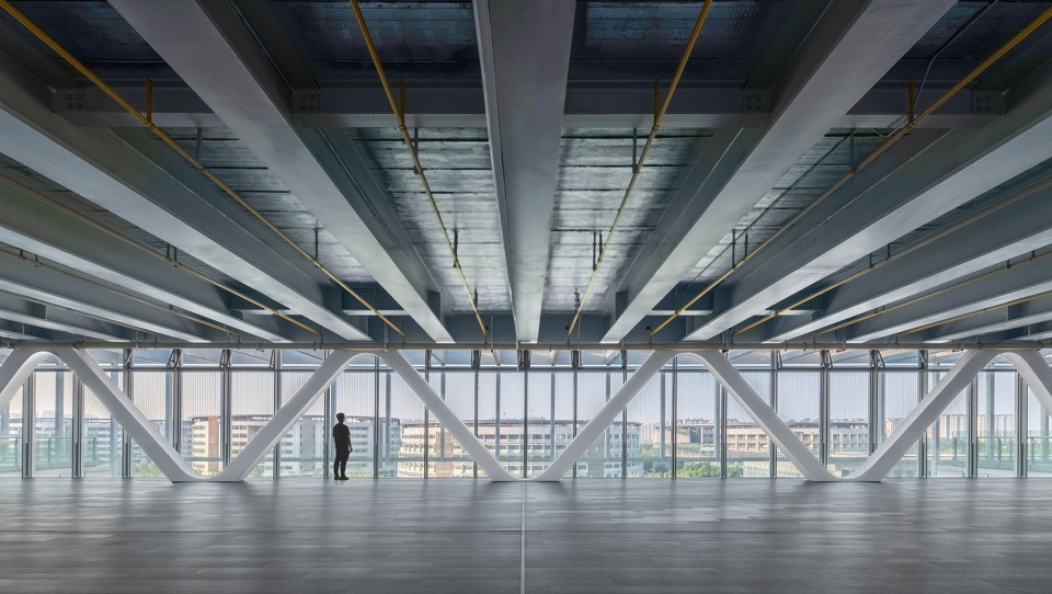 结构体系引入桥梁建构逻辑,采用“钢骨柱 + 钢桁架”的组合形式。钢桁架依功能与空间需求分楼层交叉布置,四角设置钢筋混凝土核心筒作为主要抗侧力单元;桁架单元每层对称组合、逐层旋转交叉,在减少额外支撑的同时充分利用层间架空空间,提升使用效率。