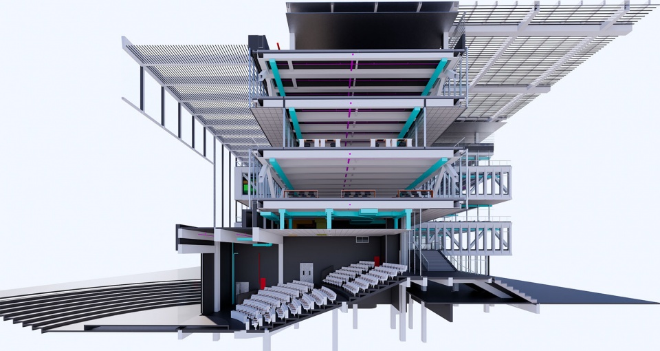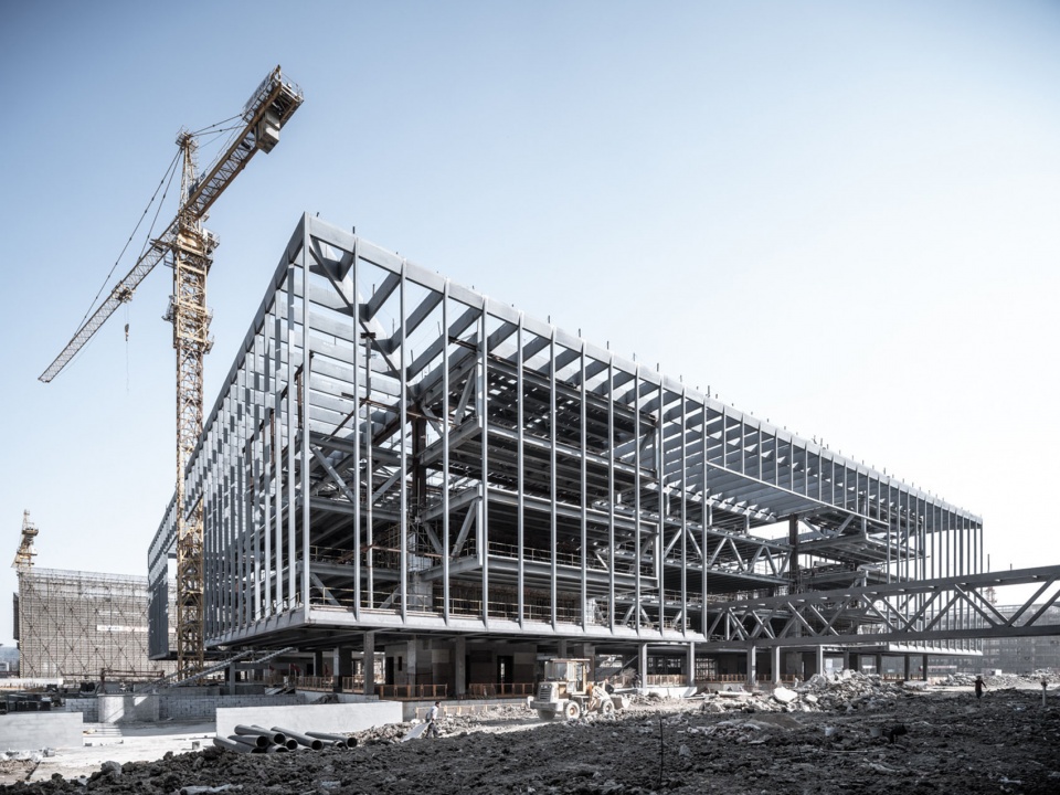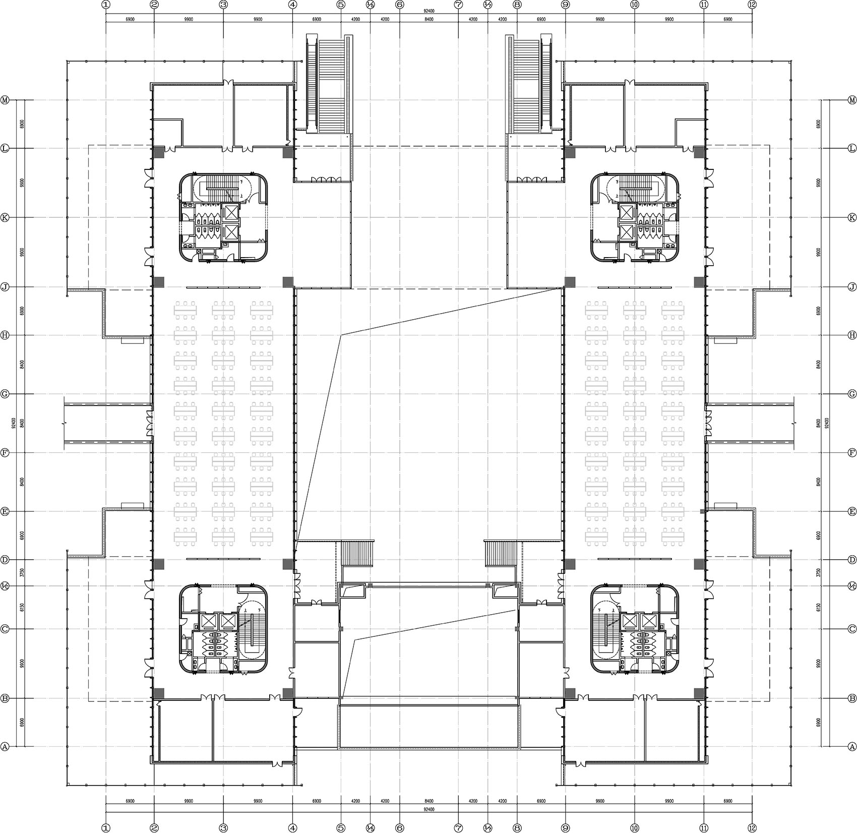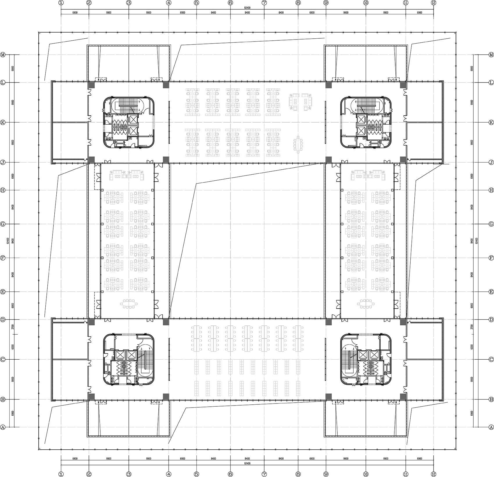 结构体系引入桥梁建构逻辑,采用“钢骨柱 + 钢桁架”的组合形式。钢桁架依功能与空间需求分楼层交叉布置,四角设置钢筋混凝土核心筒作为主要抗侧力单元;桁架单元每层对称组合、逐层旋转交叉,在减少额外支撑的同时充分利用层间架空空间,提升使用效率。