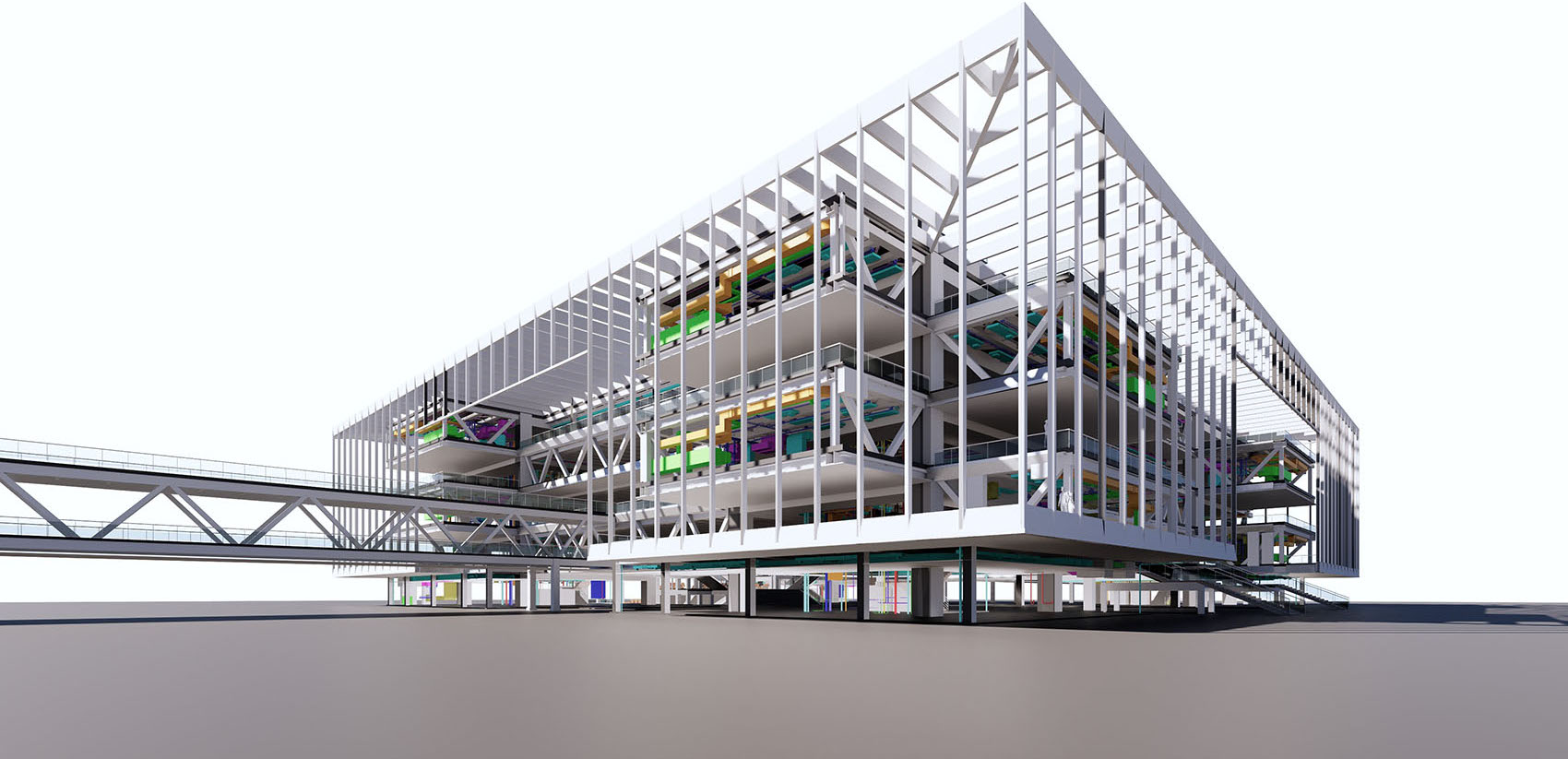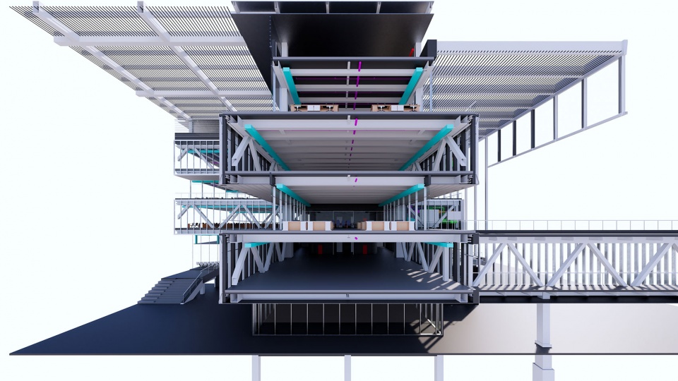 Adopting bridge structural logic, the system combines steel composite columns with steel trusses. The trusses are cross-layer arranged to fit functional needs, with four-corner RC core cores resisting lateral forces. Symmetric and staggered truss layouts minimize auxiliary supports, optimize overhead spaces and enhance operational efficiency.