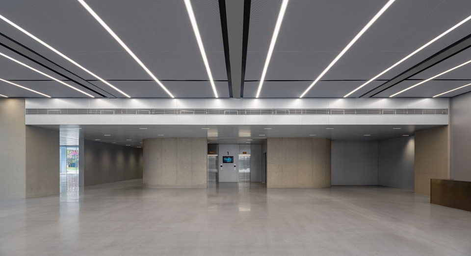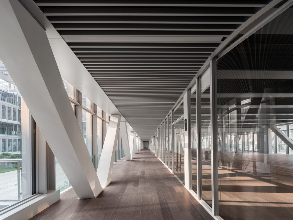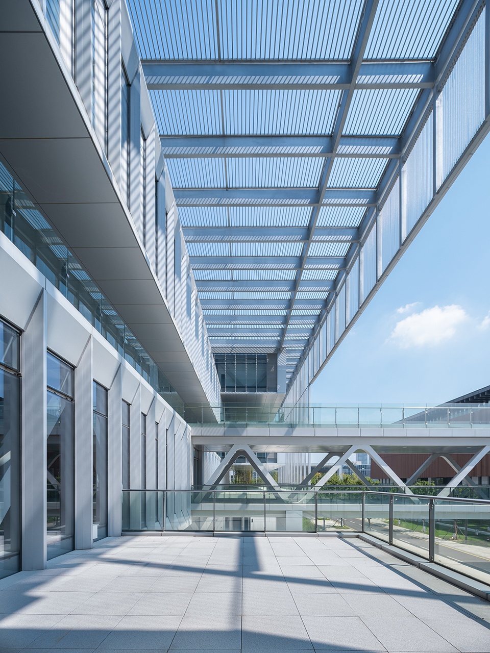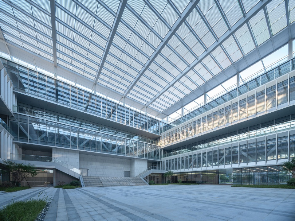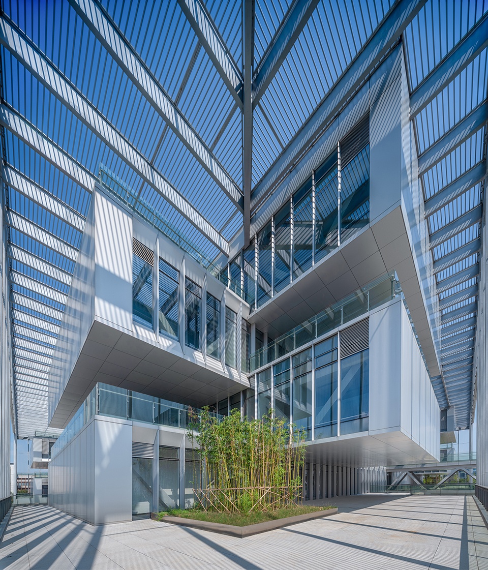 体量的多维穿插进一步生成一系列公共开放的立体空间。方形中庭开阔明亮,为室内引入自然光;外部边庭层次错落,形成可穿行、可停留、可观看的灰空间系统。这些不被单一功能限定的空间相互渗透、彼此联动,为人员交流与日常活动提供弹性承载,让技术属性强烈的建筑获得更具温度的人文界面。
