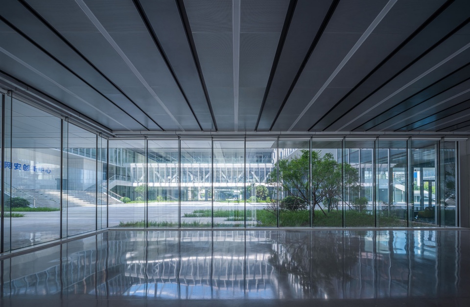 As a key node on the north-south axis of the Cybersecurity Base, the building adopts partial entrance voids to connect the inner courtyard and outer square in a continuous pedestrian sequence, turning the building into an open public space for gathering and communication.