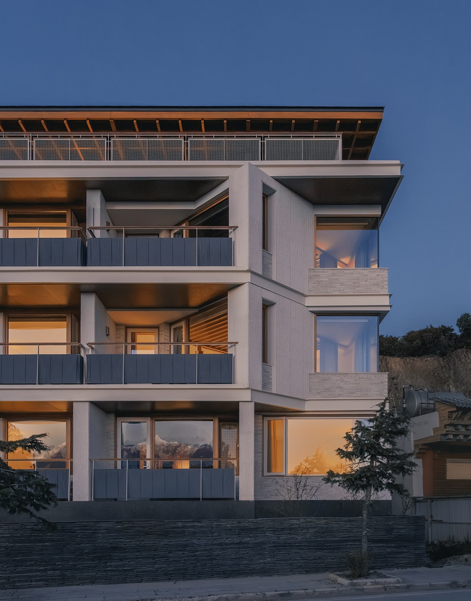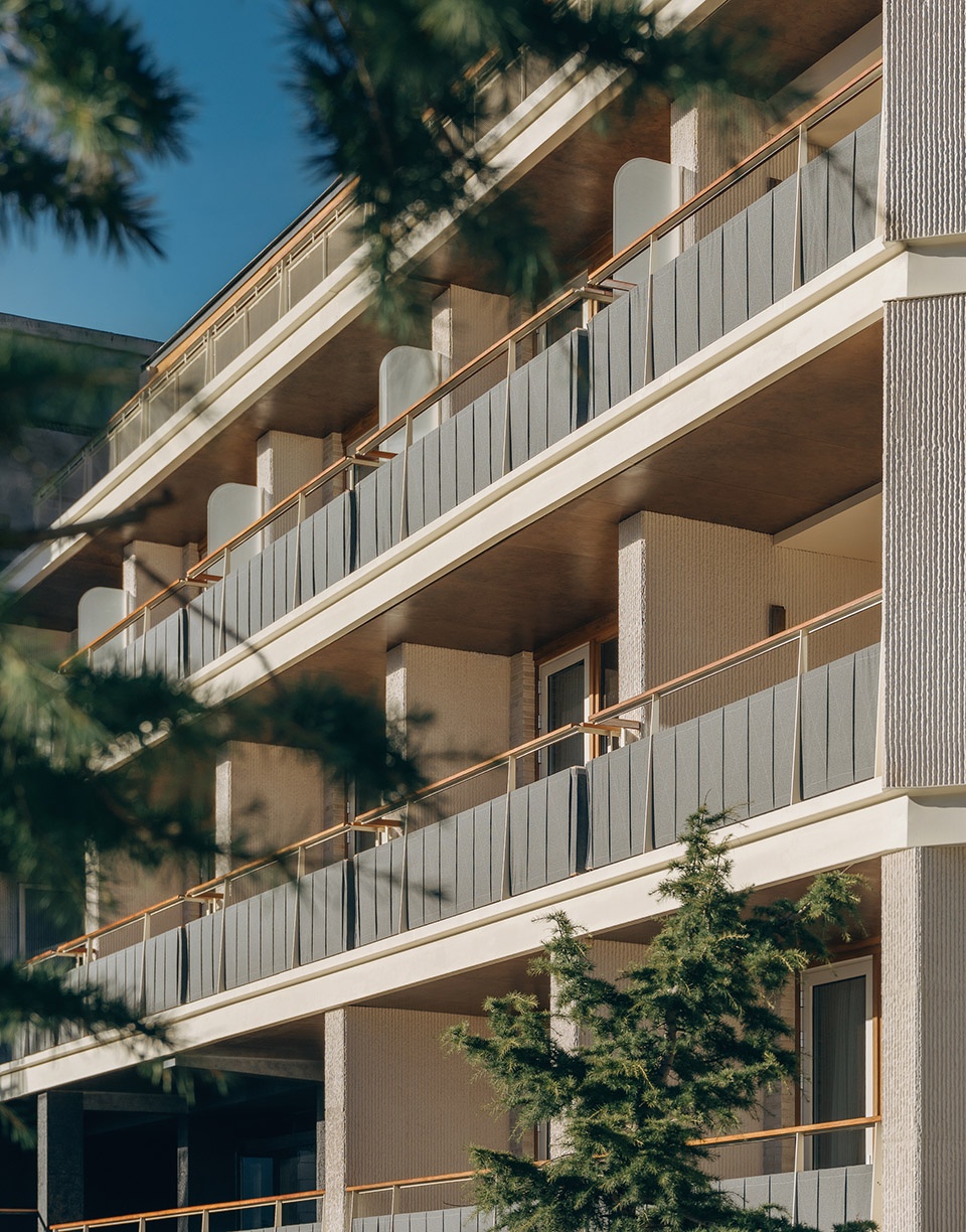 The building is conceived as a restrained white volume. Its façades are clad in dry-hung white sandstone with a deliberately retained chisel-marked texture, giving the exterior a muted, tactile presence. The fourth-floor café roof extends horizontally, while the southern terrace is slightly recessed to emphasize the clarity of the mass below. Guest-room balconies are enclosed with suspended grey textile screens that act as balustrades, introducing rhythm and softness to the façade.