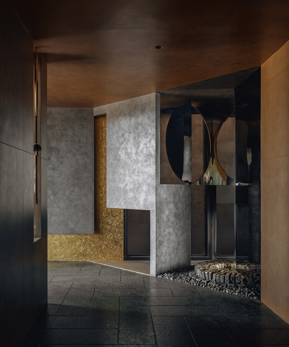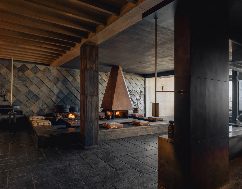 Several spatial motifs reinterpret elements of Tibetan domestic life. In local houses, the relationship between the hearth, the water shrine, and the central column organizes a subtle axis between the sacred and the everyday. In the hotel, this is translated into a spatial sequence: a dark mirrored installation near the entrance evokes water; a freestanding copper fireplace anchors the lobby as a place of warmth and gathering; and the central column rising through the atrium draws the eye upward toward the upper lounge and, beyond it, toward the mountain. Together these elements form a gradual path from enclosure to openness, from intimacy to distance.