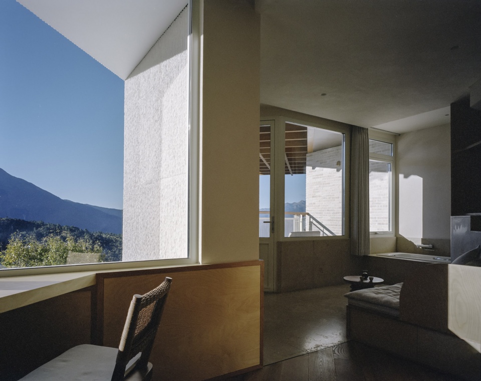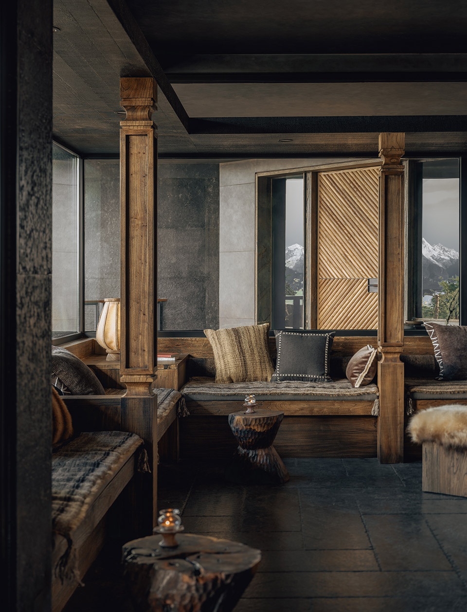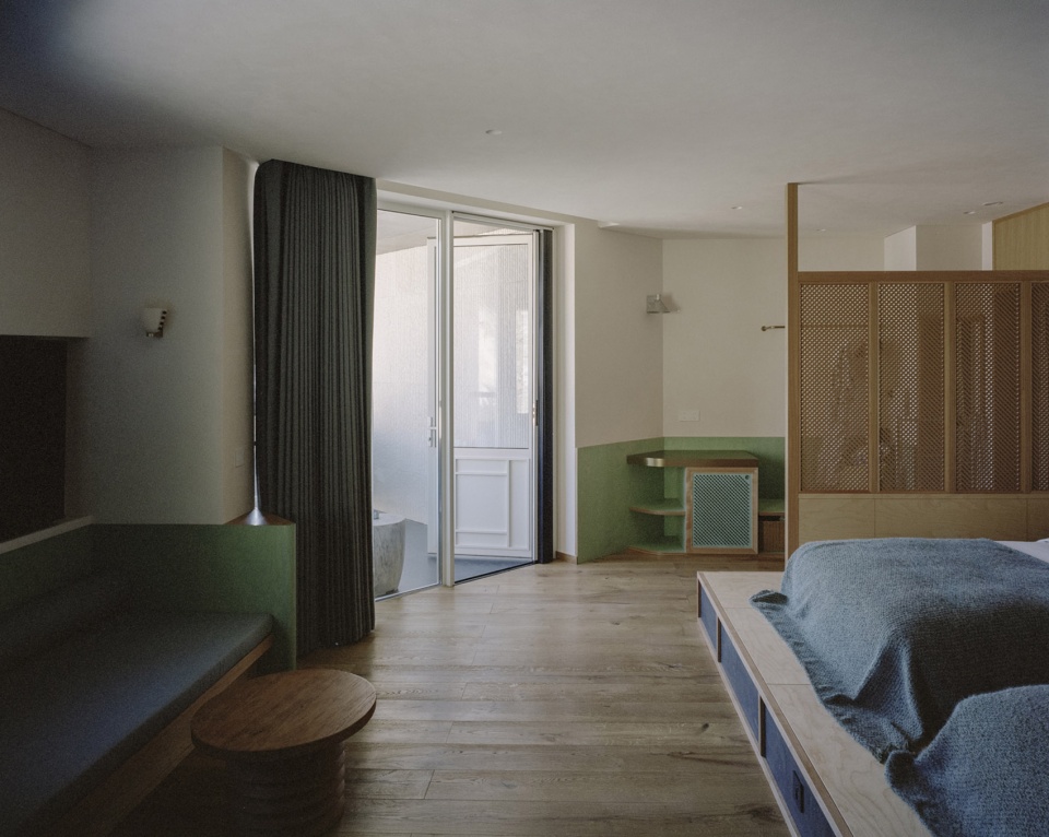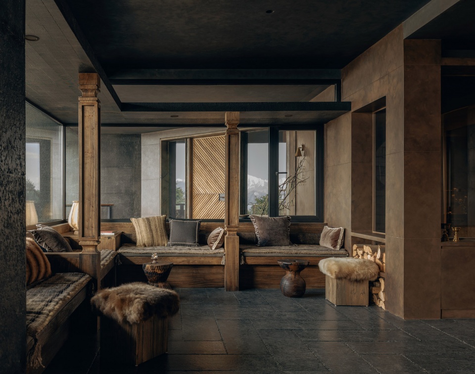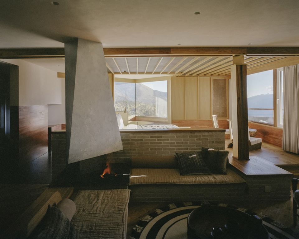 In the guest rooms, the designers moved away from the standard hotel formula of bed, corridor, and bathroom. Instead, each room is organized as a loose sequence of domestic “living islands”: an entry vestibule for changing shoes, a seating area by the stove, a raised bed platform, a desk and bathtub by the window, and in some cases a curved stair leading to an upper level. Half-height partitions, timber screens, shelving, and curtains shape views without closing them off entirely. Lower ceiling heights, denser beam rhythms, and deeply framed windows produce a stronger sense of enclosure. The windows are designed as thick openings combined with daybeds or ledges, allowing guests to sit within the depth of the wall and experience the changing plateau light throughout the day.