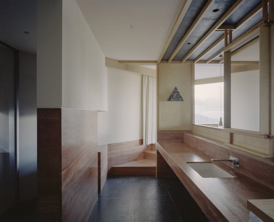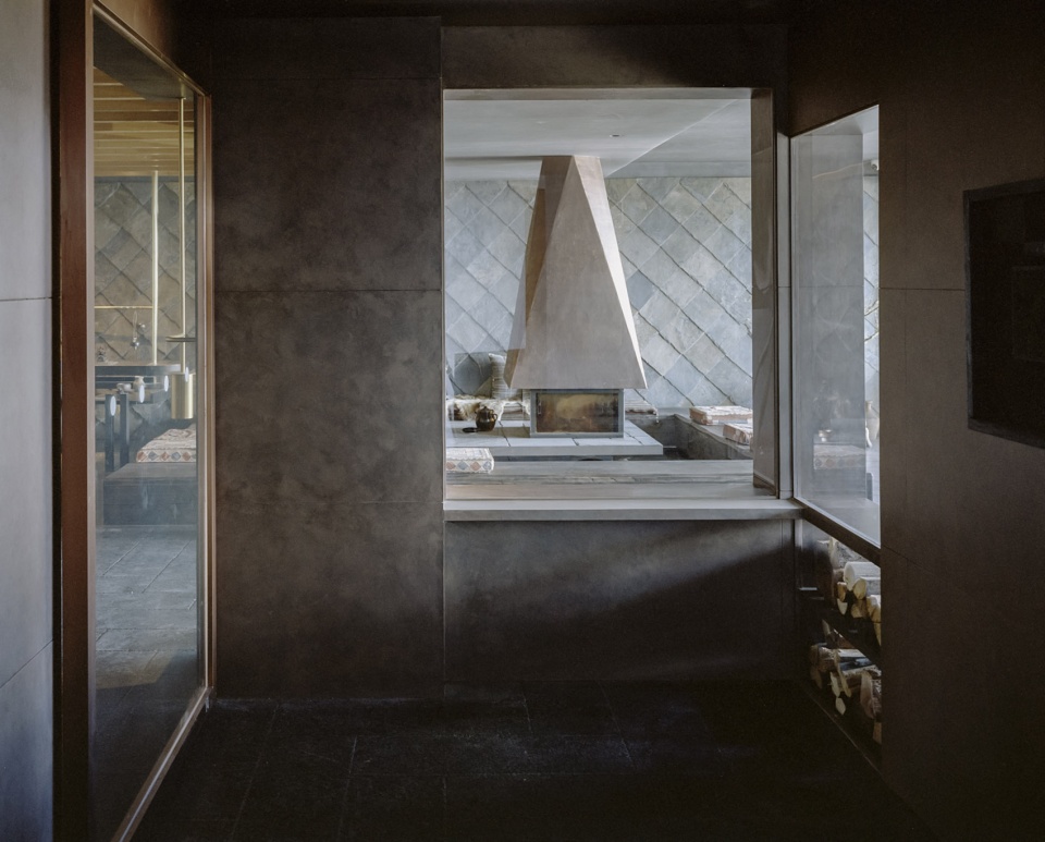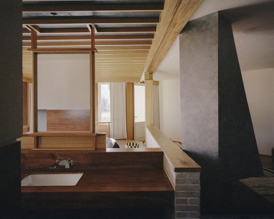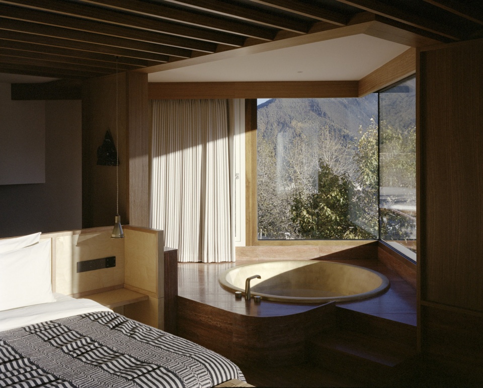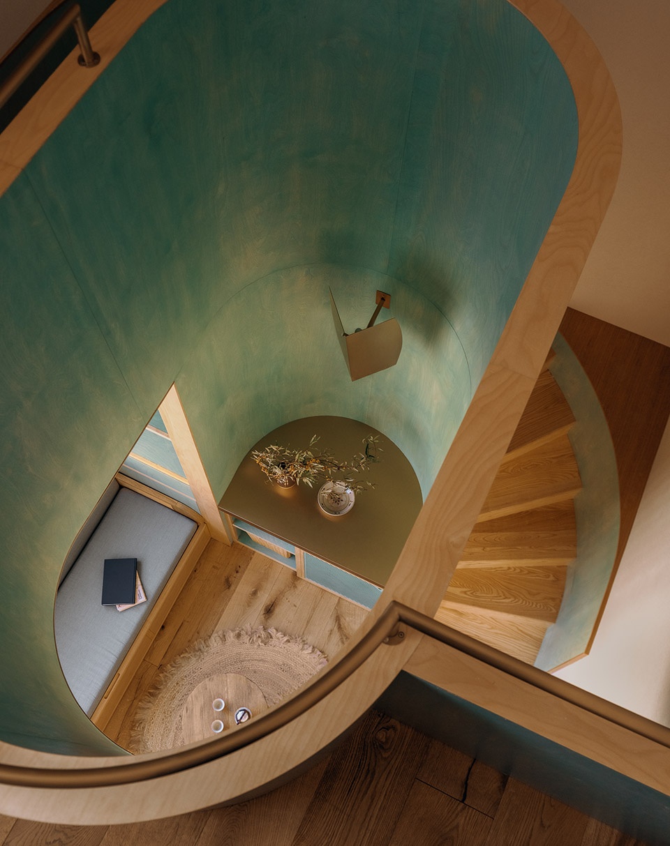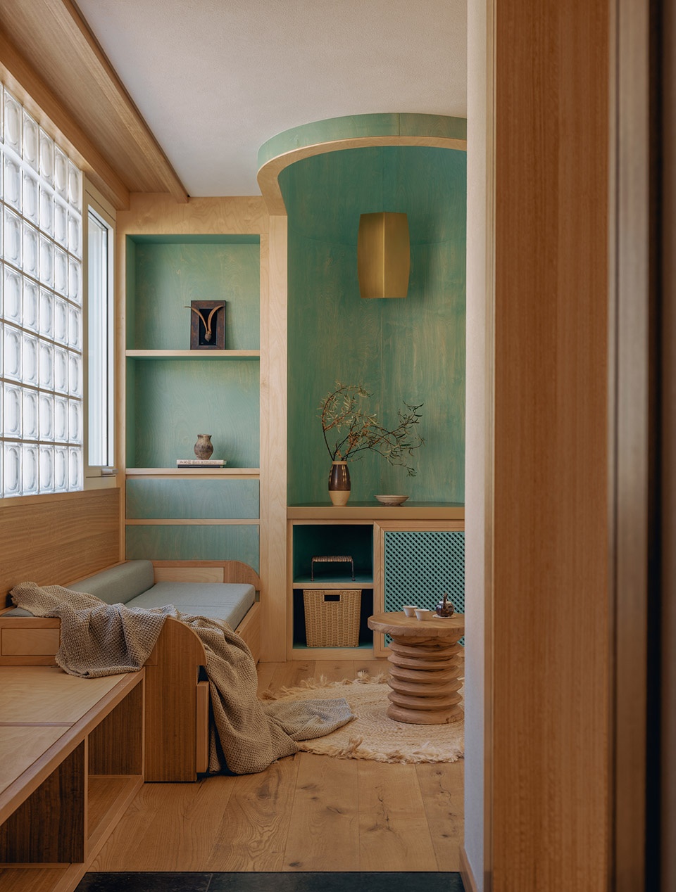 In the guest rooms, the designers moved away from the standard hotel formula of bed, corridor, and bathroom. Instead, each room is organized as a loose sequence of domestic “living islands”: an entry vestibule for changing shoes, a seating area by the stove, a raised bed platform, a desk and bathtub by the window, and in some cases a curved stair leading to an upper level. Half-height partitions, timber screens, shelving, and curtains shape views without closing them off entirely. Lower ceiling heights, denser beam rhythms, and deeply framed windows produce a stronger sense of enclosure. The windows are designed as thick openings combined with daybeds or ledges, allowing guests to sit within the depth of the wall and experience the changing plateau light throughout the day.