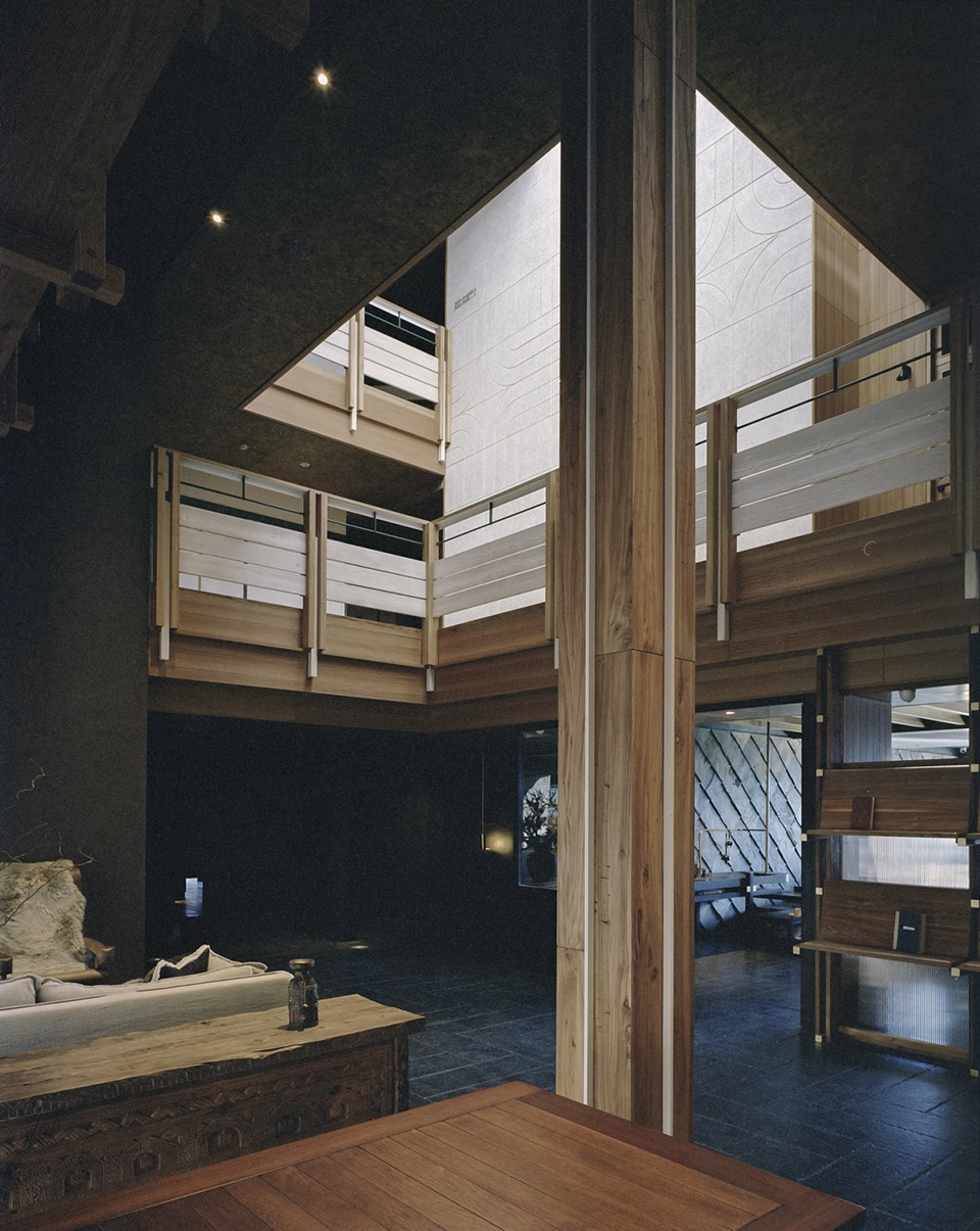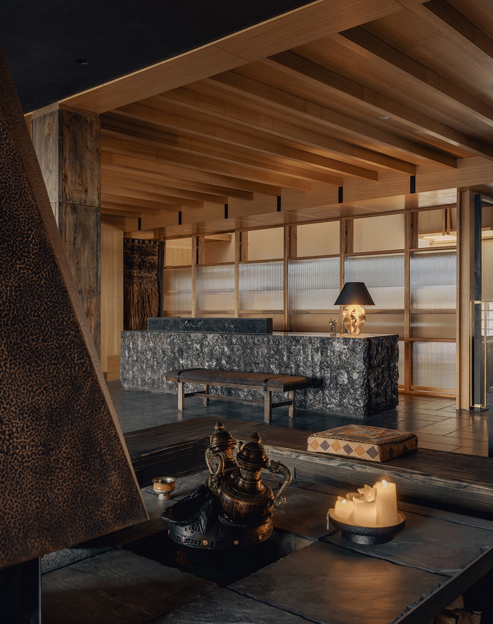 在空间叙事上,项目还借用了藏房中“水亭—火塘—中柱”的关系。入口木门后设置压低光线与声响的前厅,并以黑镜装置形成一处具有“水面”意象的空间节点;大堂中央布置铜壁炉,以火的聚拢性与中心性回应传统火塘;贯穿中庭的中柱则持续将视线引向四层观景客厅及更远处雪山。由此,入口、接待区与中庭共同构成一条由内向外、由日常走向更高精神指向的空间路径。
