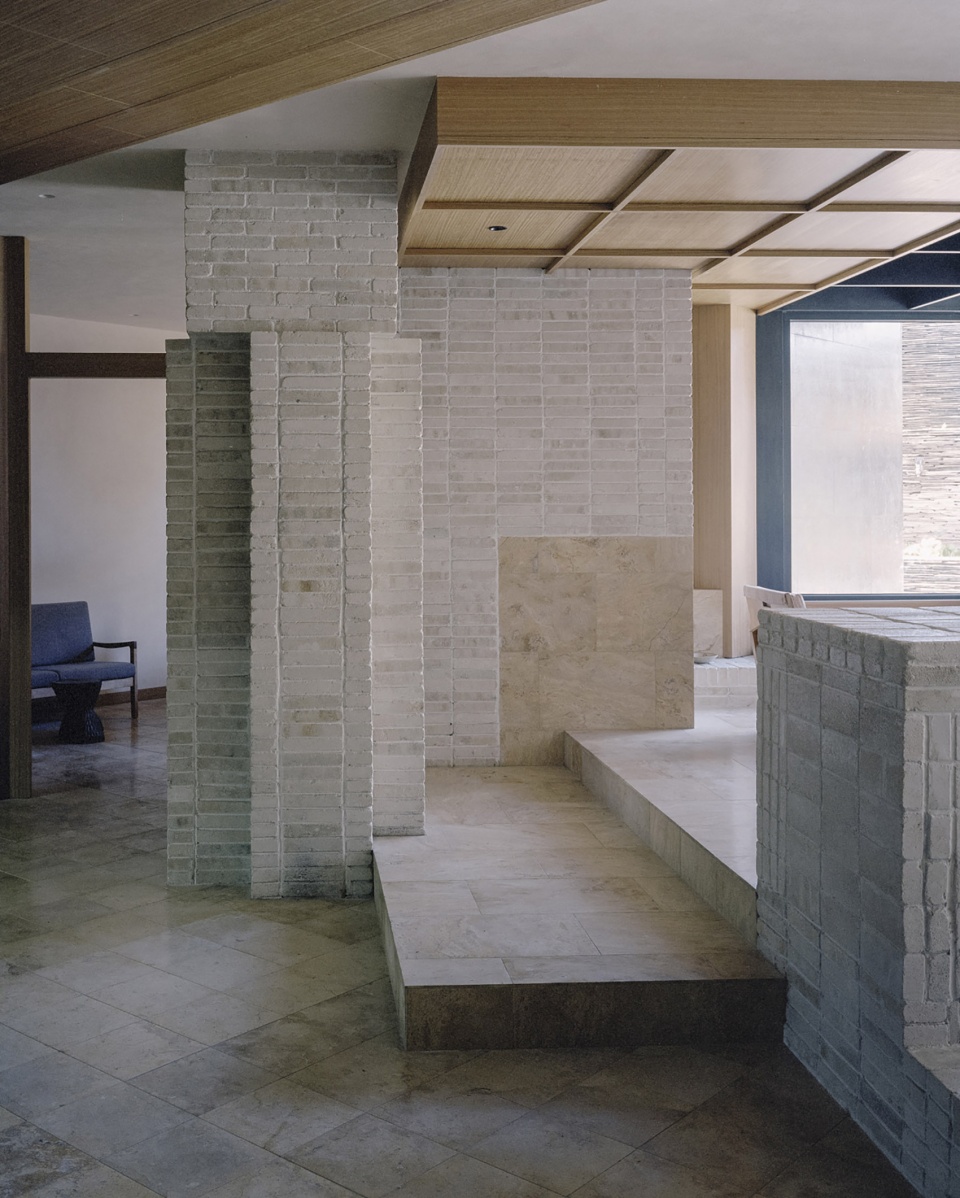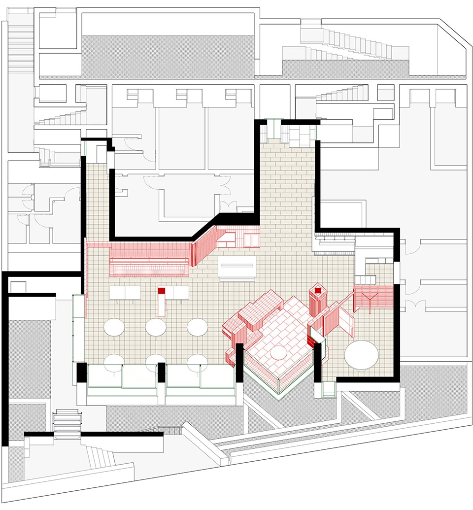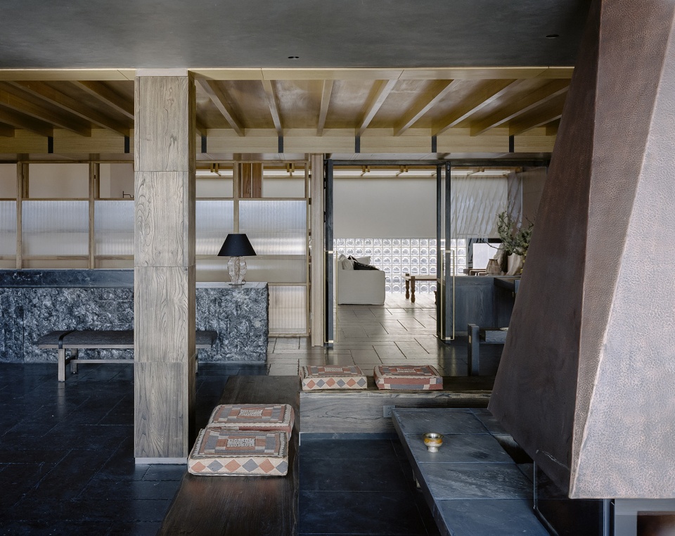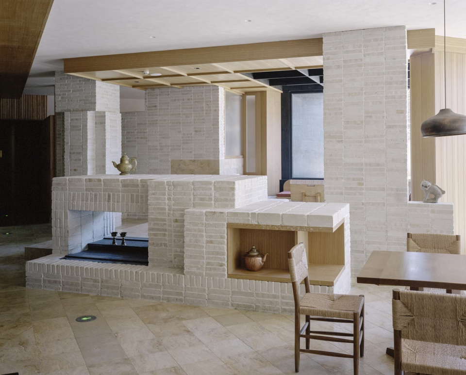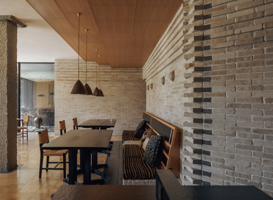 The restaurant, located on the lower ground floor, is organized by brick masses, steps, and platforms. Columns, low walls, and block-like volumes are all built from modular brickwork, which functions simultaneously as structure, furniture, and partition. Timber ceilings and framed openings direct views toward the courtyard and the hillside, while intense plateau sunlight is broken by exterior retaining walls and reflected back into the room as soft diffuse light. Though the geometry has a certain abstract rigor, tactile materials — brick, wood, stone, woven textiles, yak leather — keep the space grounded in ordinary acts of eating, gathering, and lingering.