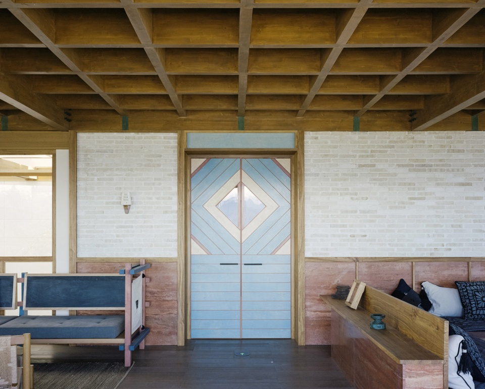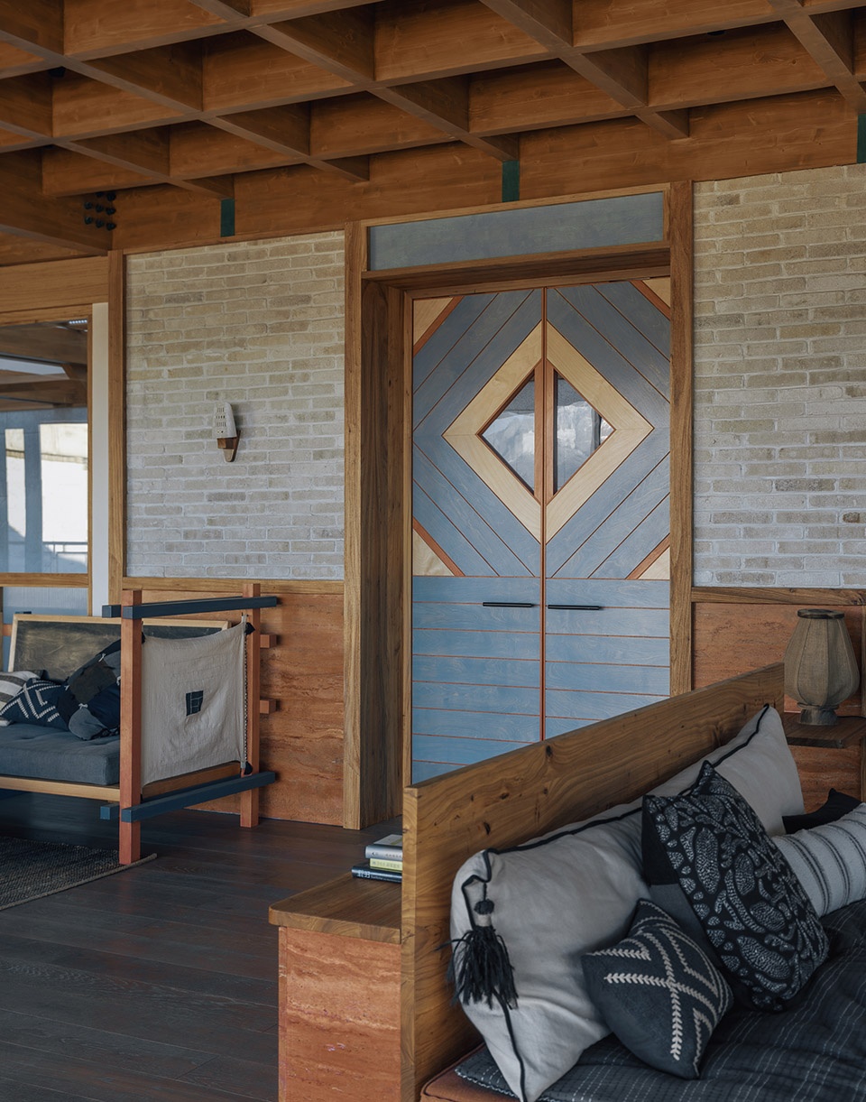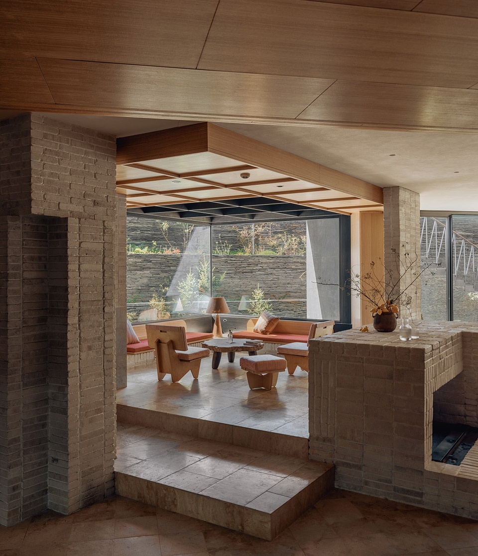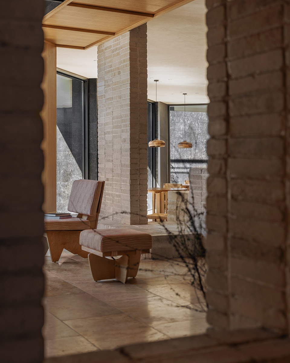 位于负一层的餐厅以砖砌体块、台阶与平台组织平面。陶砖在统一模数控制下形成柱、矮墙及不同尺度的体块,兼具结构、家具与界面功能;木饰吊顶在局部形成框景,将视线引向庭院与山坡。高原强光经庭院挡墙与台阶反射后转化为柔和的漫射光,使餐厅空间在几何秩序中保持温暖、可停留的日常氛围。公共区域的坐垫与靠包则大量使用来自甘孜、理塘与甘南地区牧民家庭作坊的手工织布与牦牛皮。设计在合作中尽量保留其原有配色、配线与手工误差,使材料呈现更真实的触感与地方性。