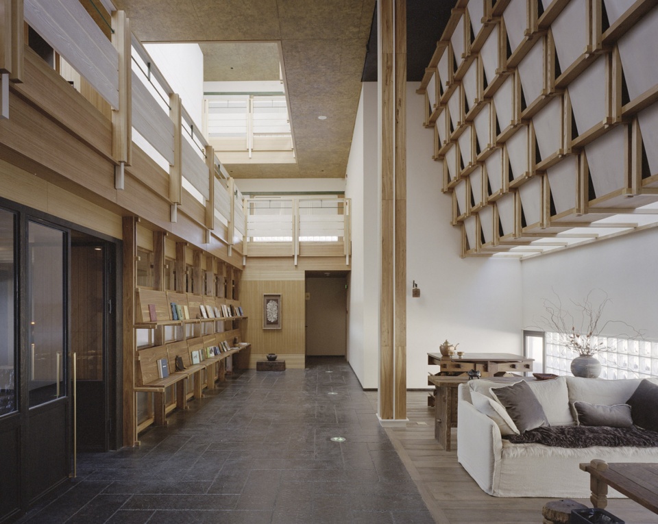▼酒店中庭空间与寺院殿堂的柱列与高窗呼应,The atrium space of the hotel echoes the columned and high-windowed layout of the temple halls