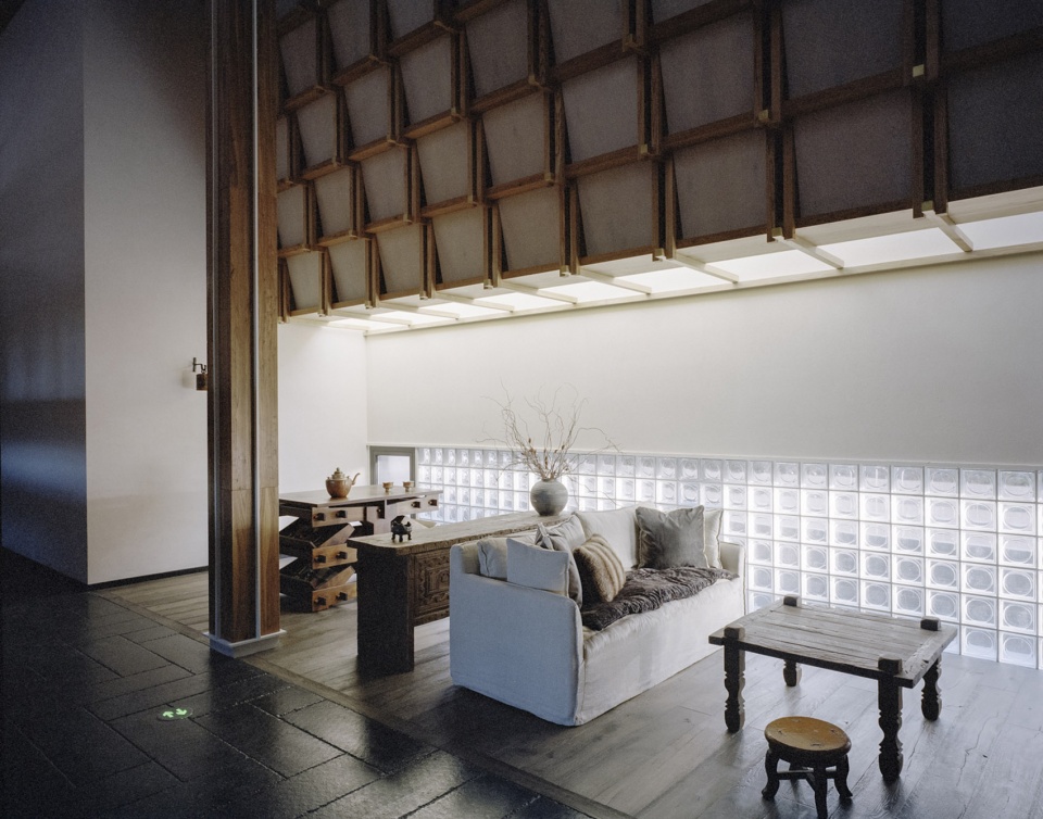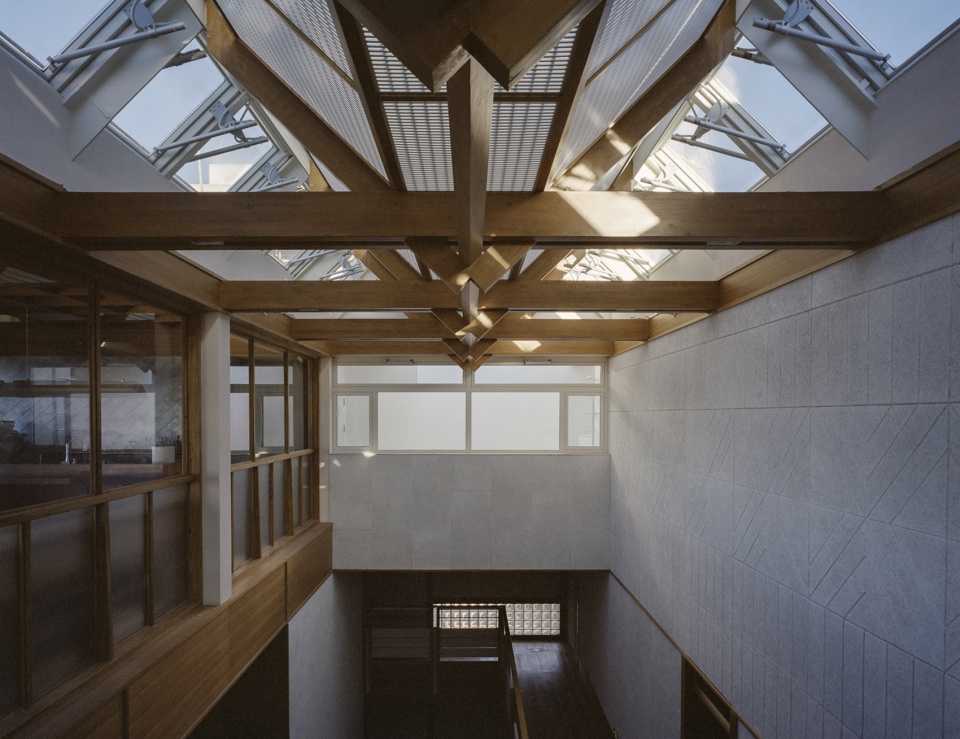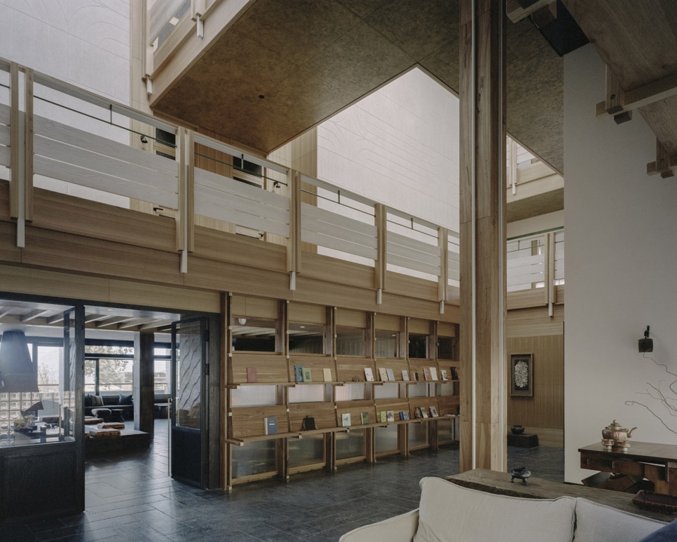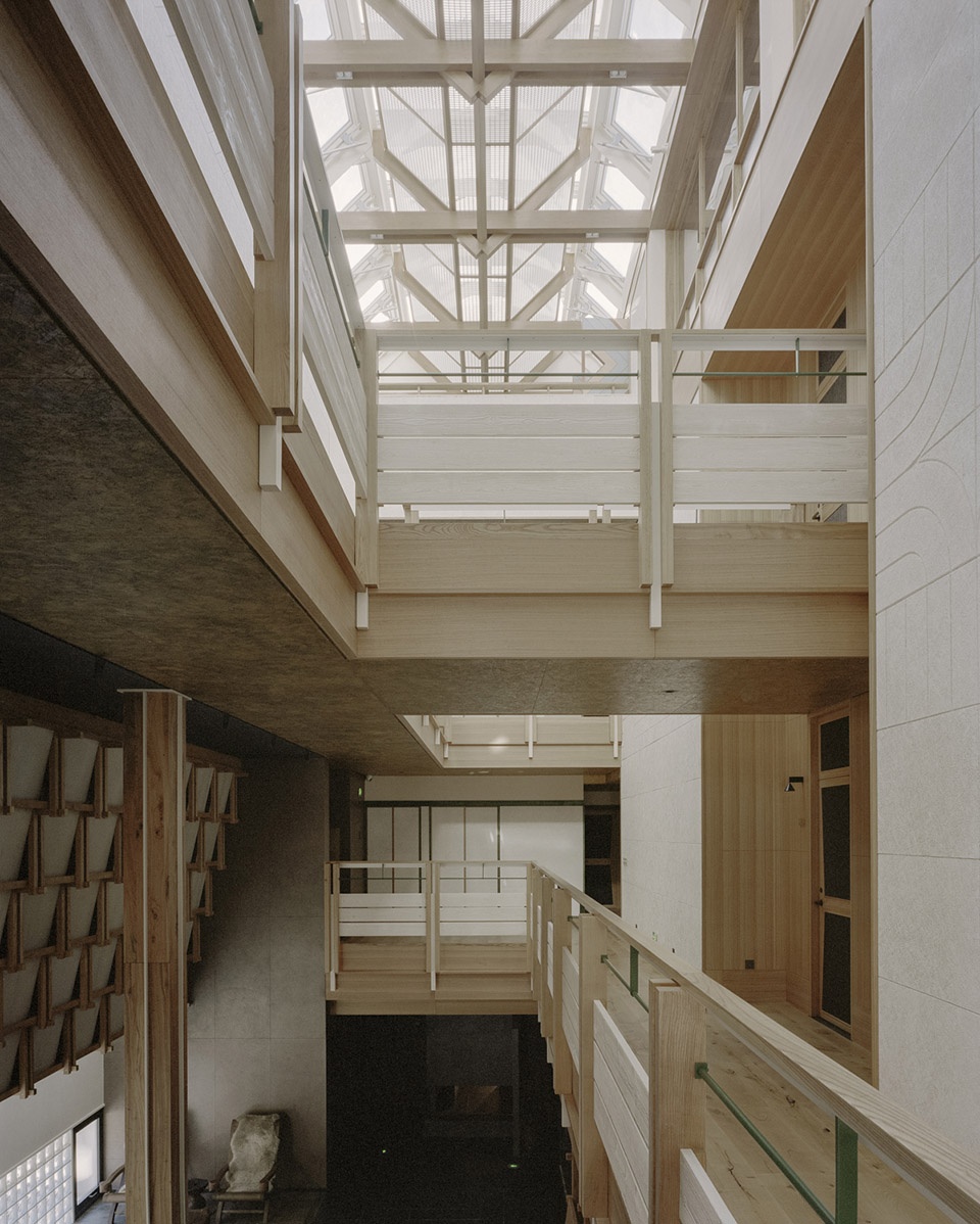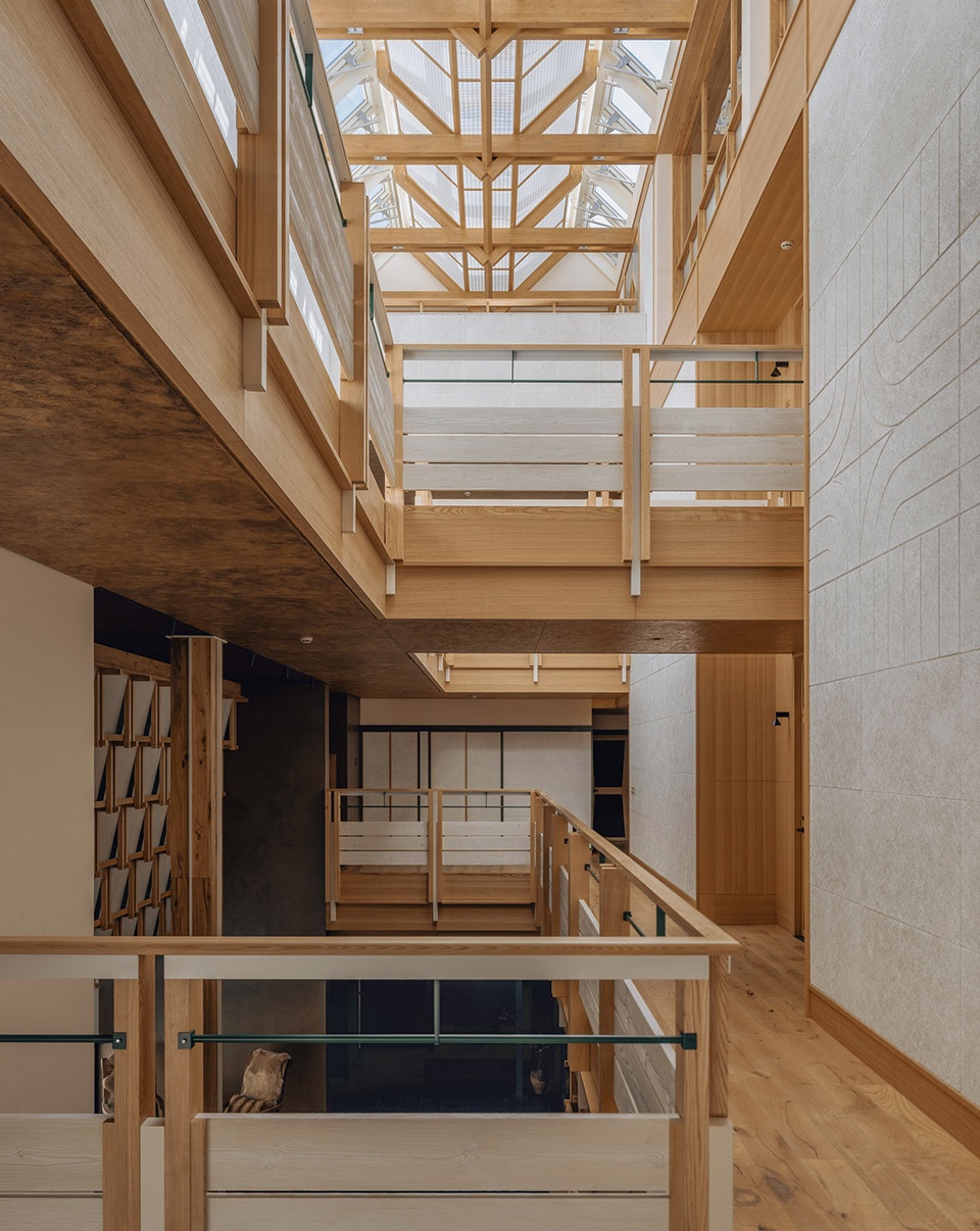 Daylight enters the atrium from above and is softened by timber beams, grilles, and balustrades, casting shifting shadows onto walls and floors. Beige wood-wool acoustic panels line the interior surfaces and interact with the white stone outside to create what the architects describe as a “layered whiteness” — not a flat monochrome surface, but a field enriched by texture, ambient light, and subtle changes in material temperature. The joints of the wall panels, the proportions of the gallery balustrades, and the geometric composition of the openings all quietly recall Tibetan fabric hangings, allowing decoration to emerge from the logic of assembly. An operable skylight brings in both light and ventilation, while exposed beams beneath it frame a kind of light chamber that changes character throughout the day.