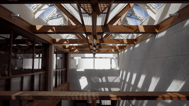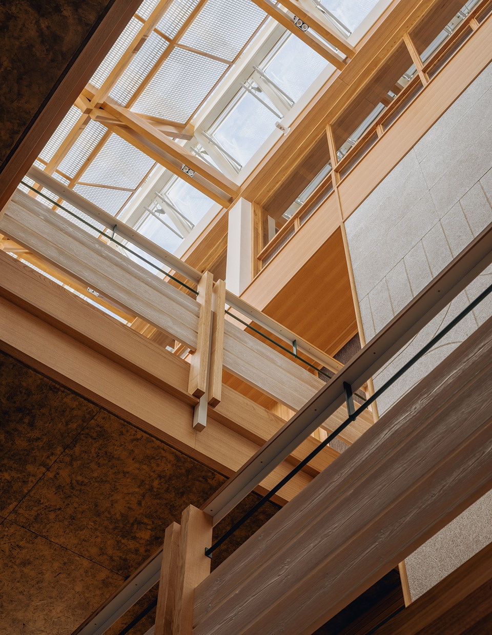 ▼木梁延续了屋盖的结构逻辑,The wooden beams continue the structural logic of the roof