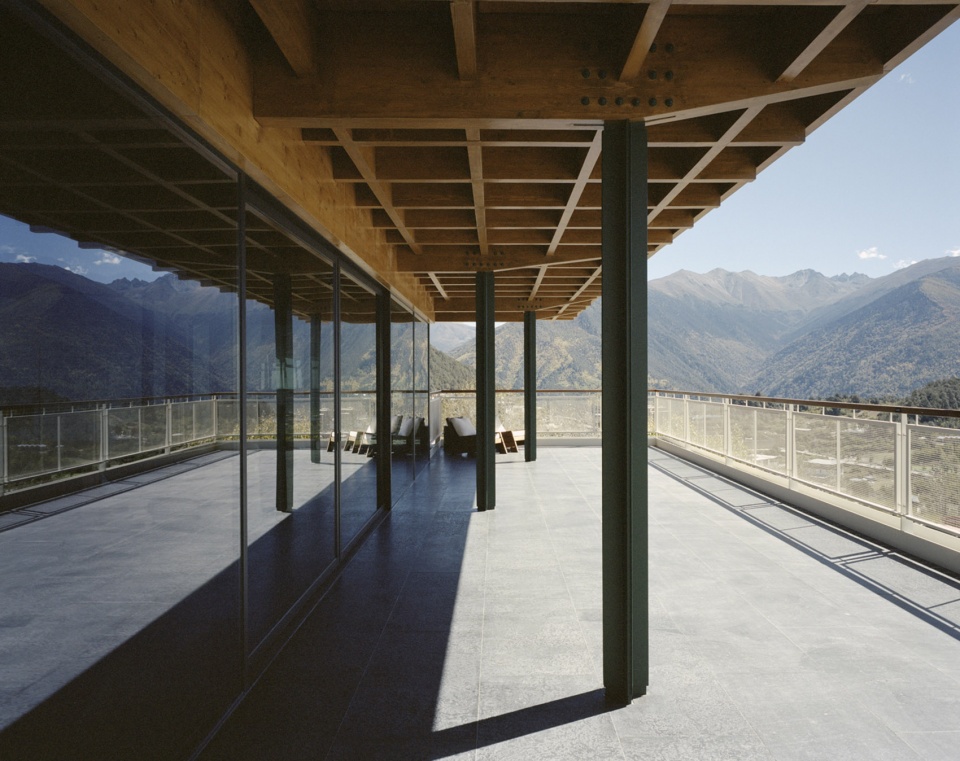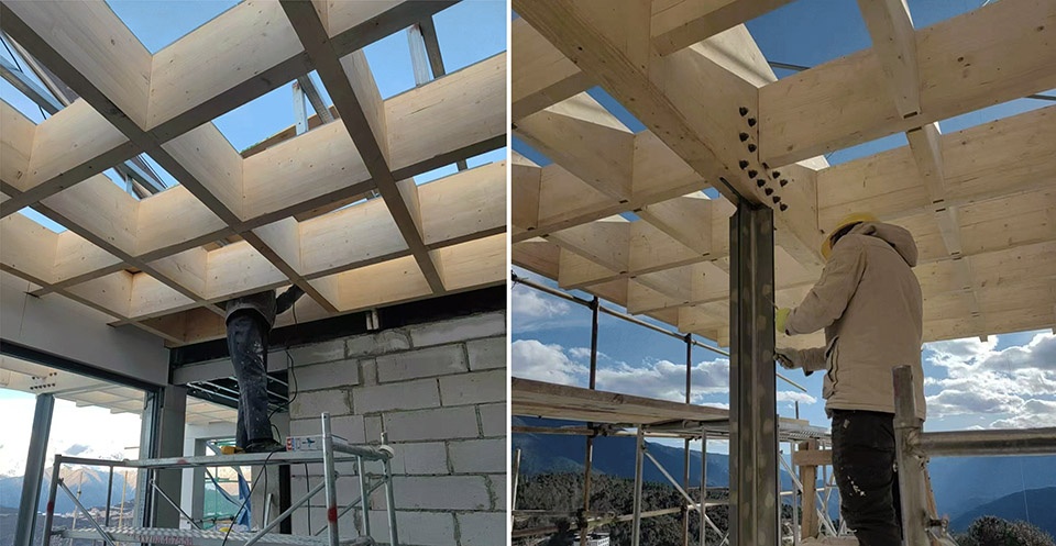 建筑顶层被设定为与雪山发生直接关系的主要公共空间。设计延续主体钢结构,以钢木混合互承体系实现21米×9米的无柱大跨,使内部获得完整连续的观景界面。六根十字形钢柱以较大的间距支撑整片屋盖,使屋盖在视觉上显得稳定且轻盈,并与远处水平展开的山体建立呼应。考虑到雾浓顶村全年真正出现“日照金山”的时间有限,顶层空间并未被设计为单纯依赖景观瞬间的观景平台,而是被组织为即使在云雾遮蔽、群山隐去时依然值得停留的公共客厅。玻璃隔断轻轻划分咖啡酒吧厅与中庭等区域,既保持视线与光线的连续,也让空间在使用上保持轻盈和通透。