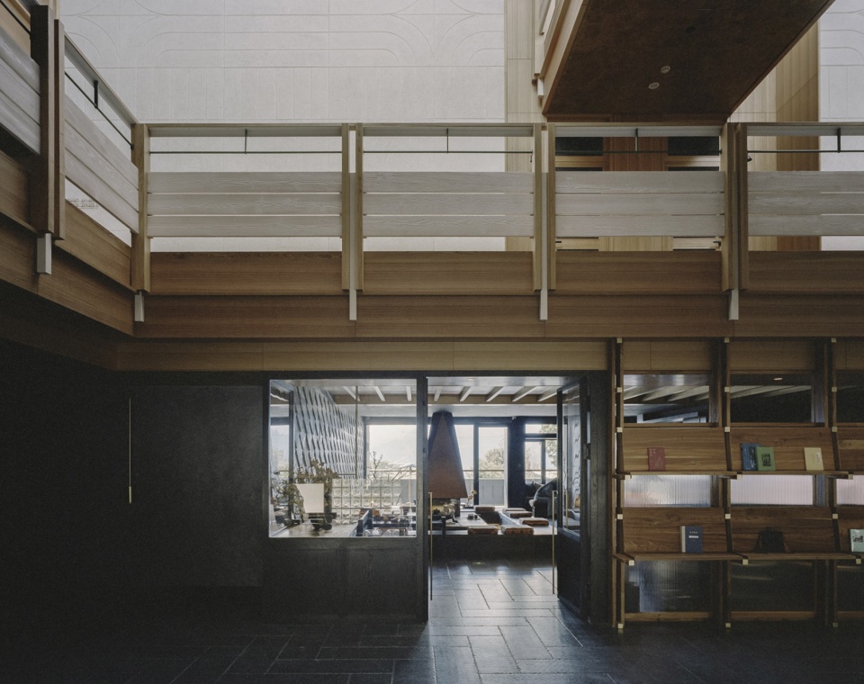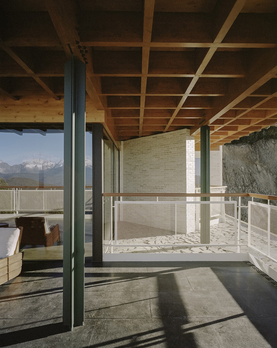 At the top of the building, a large-span café and viewing lounge was conceived as a place of encounter between visitor and mountain. Supported by a hybrid steel-and-timber system spanning 21 by 9 metres without internal columns, the room opens toward the Lancang River valley and the distant peaks. Yet the designers did not want the space to depend only on clear weather. In Wunongding village, the celebrated “golden mountain” effect appears only intermittently; much of the year is cold, cloudy, and obscured by mist. The top floor is therefore designed not simply as a viewing room, but as a place worth inhabiting even when the mountain disappears. Light glass partitions gently separate the café from the atrium, maintaining continuity of light and sightlines, while a fireplace and sheltered seating create a quiet interior atmosphere beneath the floating roof.