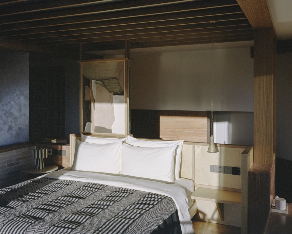 客房部分则被作为“家”的延伸来组织。设计弱化了标准酒店客房的线性动线关系,通过正交与非正交体系之间的轻微扭转,将玄关、围炉沙发、床塌、书桌与浴缸组织成一串连续展开的“起居岛屿”。半高矮墙、木格栅、书架与布帘彼此分隔又相互渗透,减少空间的完全阻断。略低的天花、较密的梁节奏与可倚靠的厚窗洞进一步增强了房间的包裹感。
