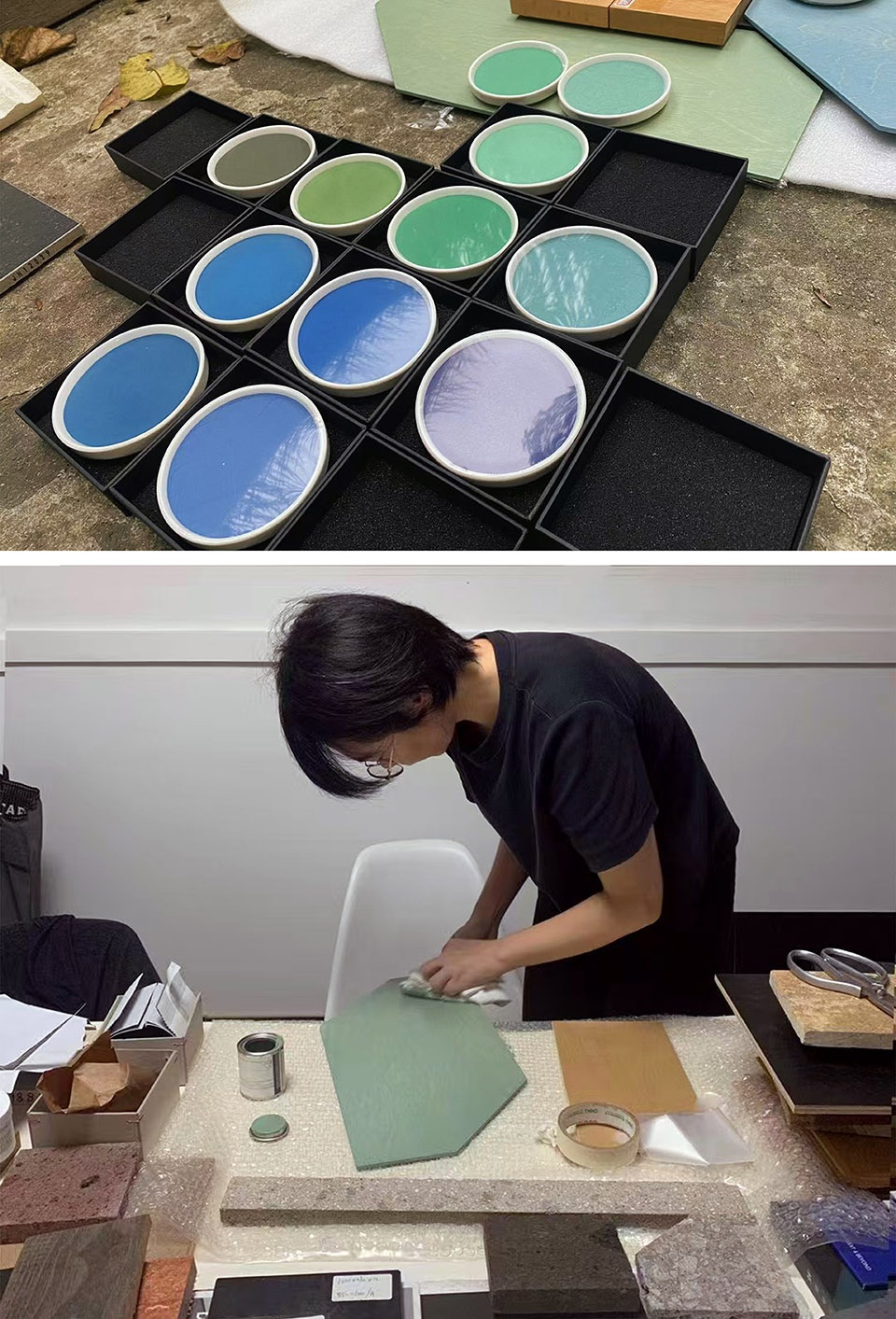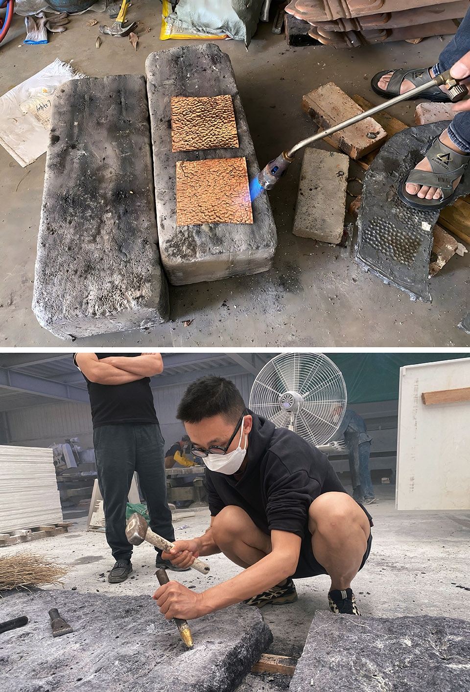 ▼左:矿物涂料染色和比选;右:指导烧铜,Mineral coating coloring and comparison selection(left) and Guiding the process of smelting copper (right)