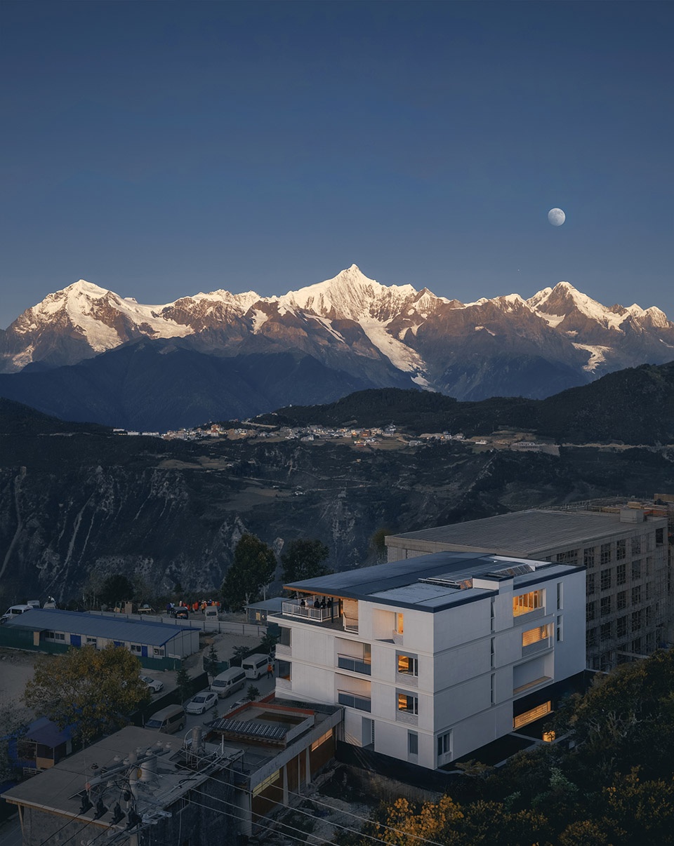 Located at the Thirteen Pagodas Viewing Platform in Kawagebo Snow Mountain National Park, Kawagebo Snow Mountain Hotel is a 2,500-square-metre hotel designed by Shanghai Moguang Studio as an integrated architectural and interior project. Set beside Wunongding Village in Yunnan Diqing Tibetan Autonomous Prefecture, the hotel occupies a highly exposed tourist site facing the sacred peaks of Kawagebo Snow Mountain.