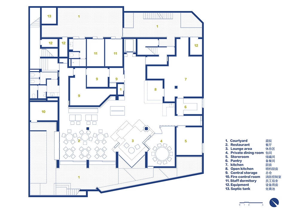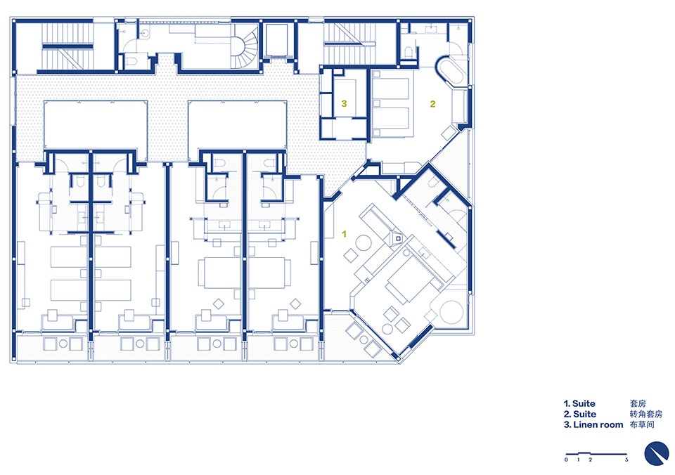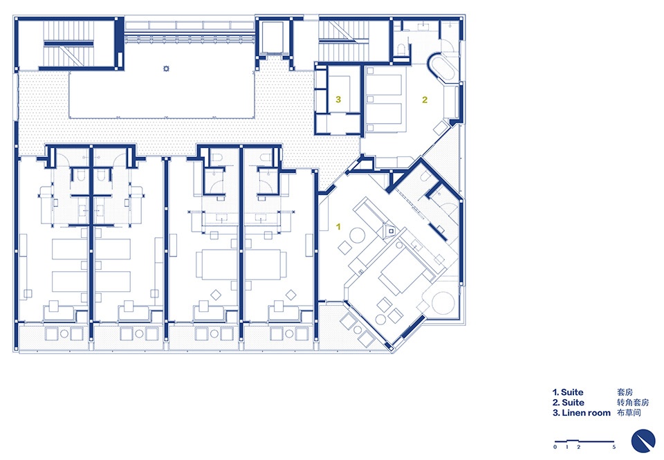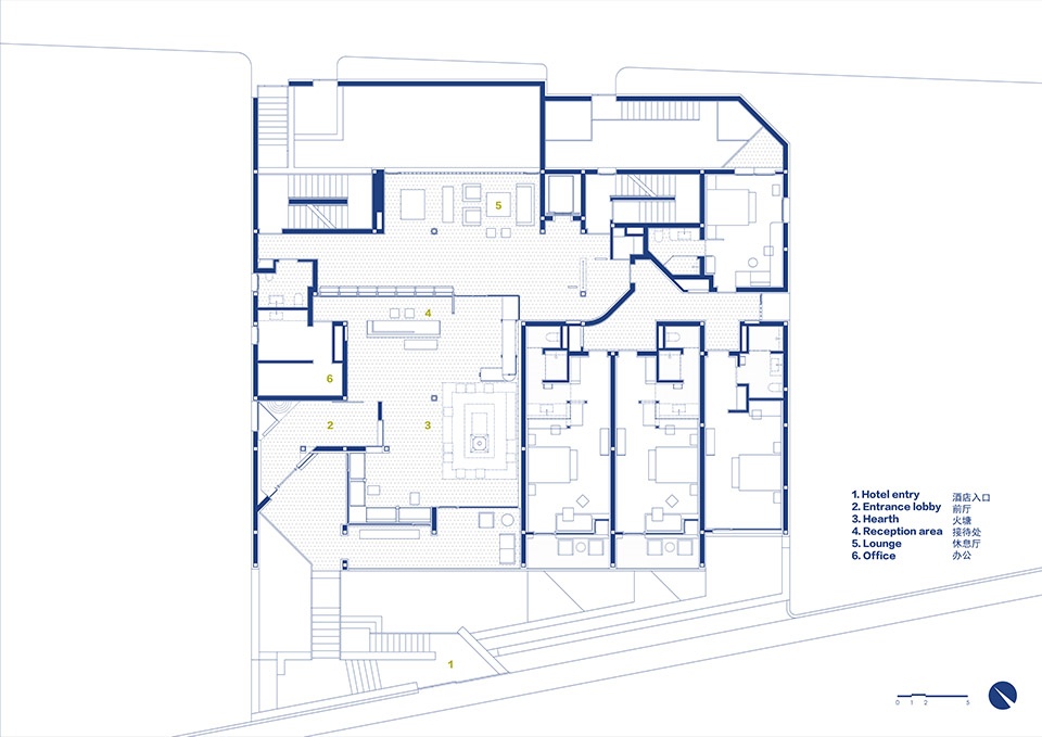在15米建筑限高下,项目若做五层,层高将过于局促;若做四层,又难以充分利用可建设条件。设计将首层整体抬高1.8米,将接待区、客房与顶层咖啡厅等主要使用空间提升至更完整、更私密的视野高度,地下则布置餐厅、厨房、后勤总仓及设备用房。客人可经入口前院跨桥进入大堂,也可沿石阶下行抵达负一层餐厅。建筑边界与道路之间形成的三角形内院,为地下空间提供了采光与自然通风。