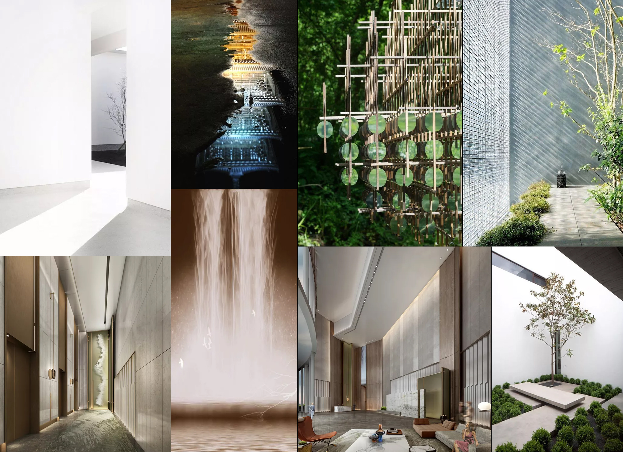 將接待入口、休息區、洽談區、藝術空間、樣板間通道等多個功能區域設計成東方古典院落中的場景,好似悠遠的住居情境融於高山流水之間。