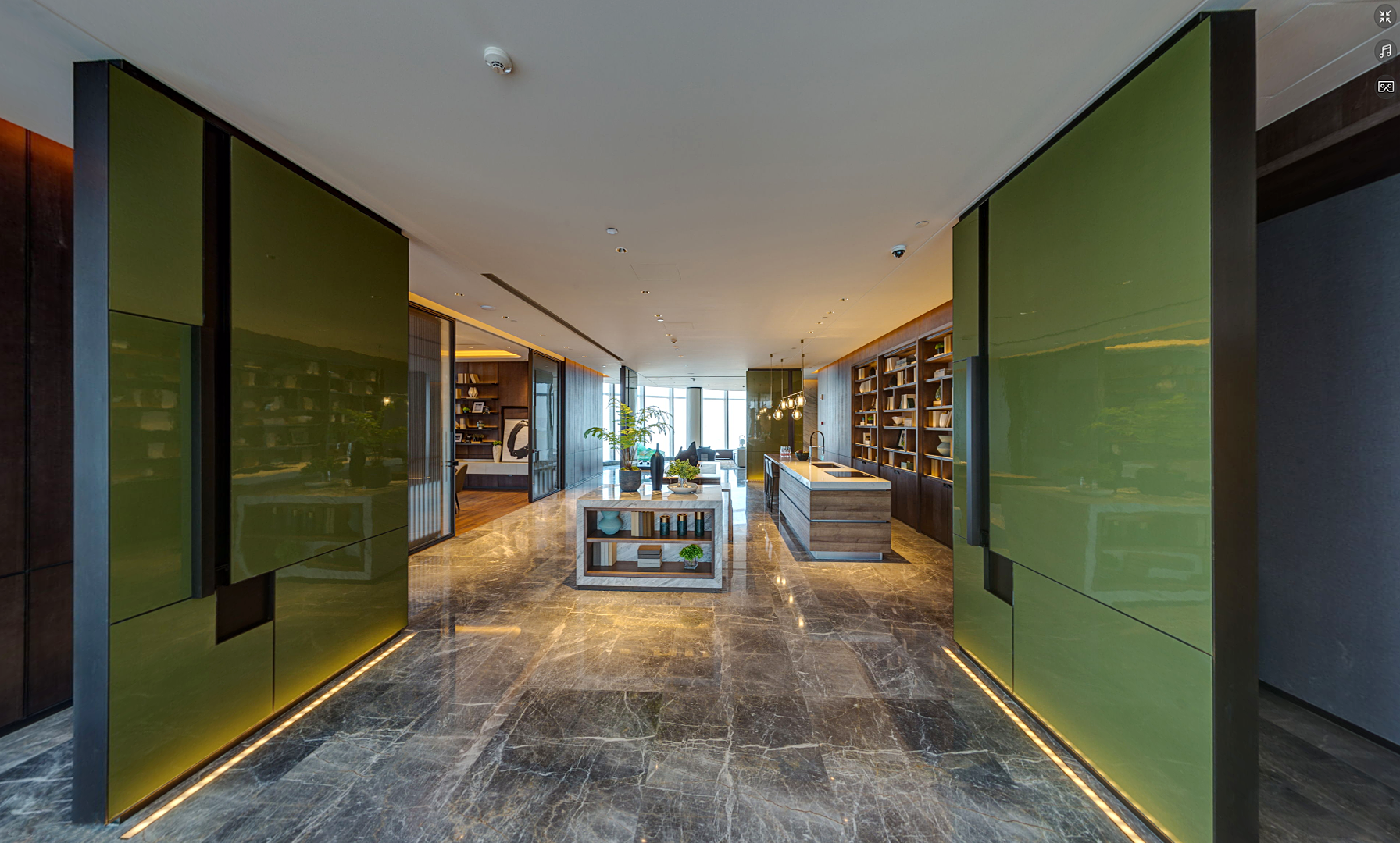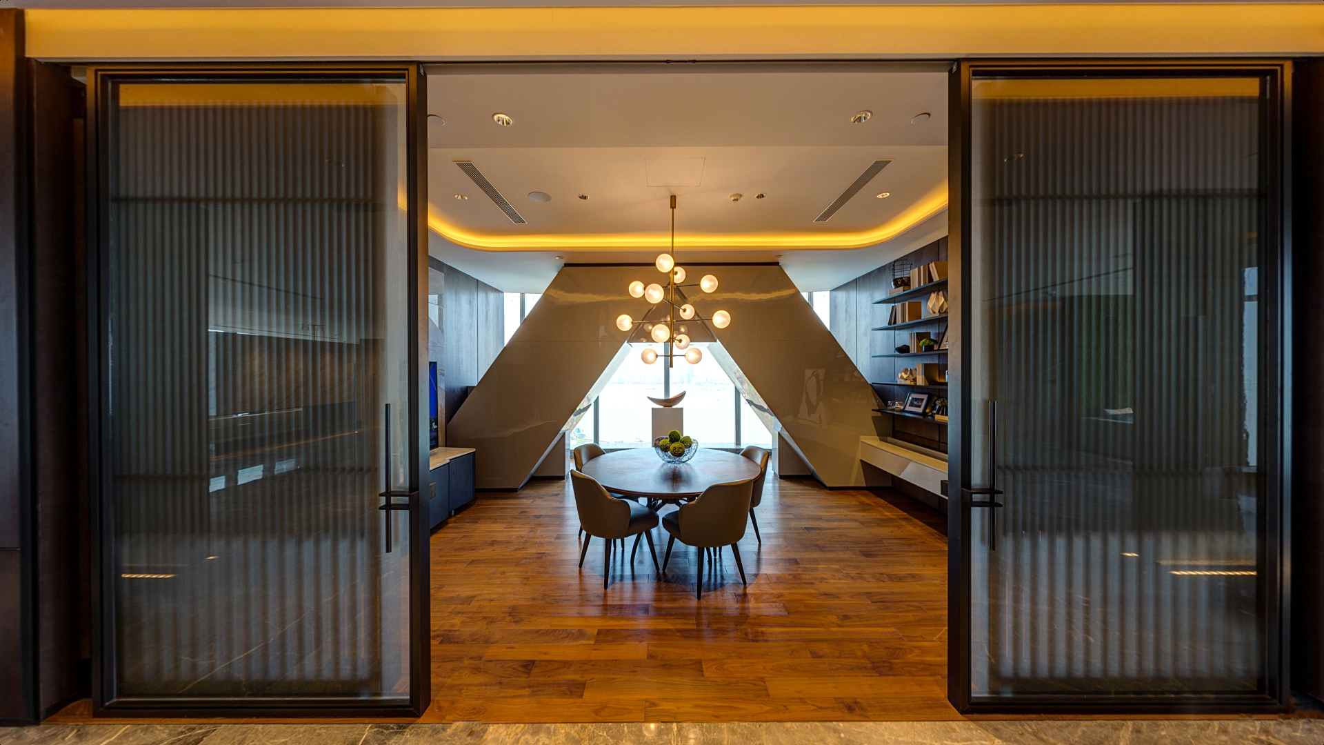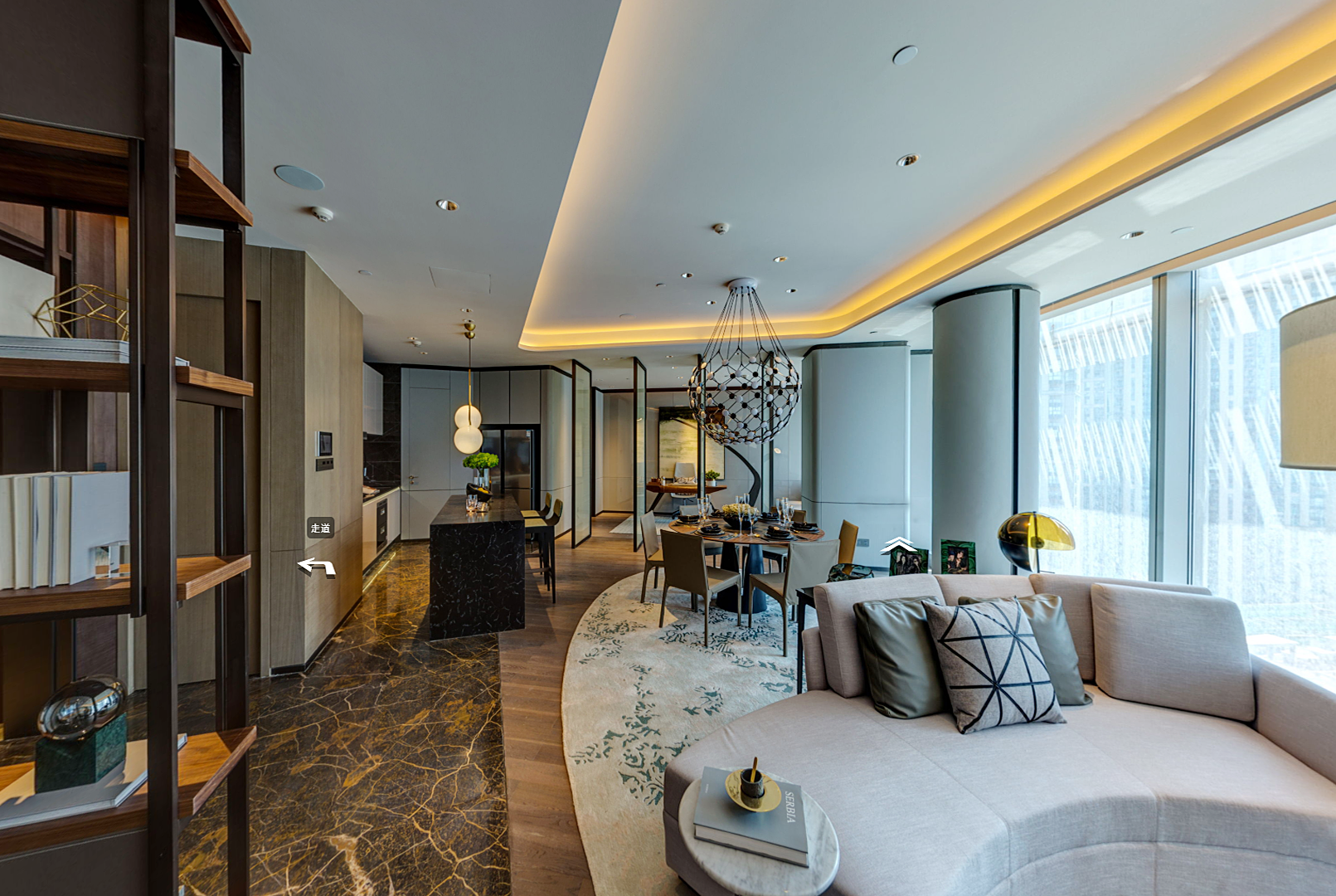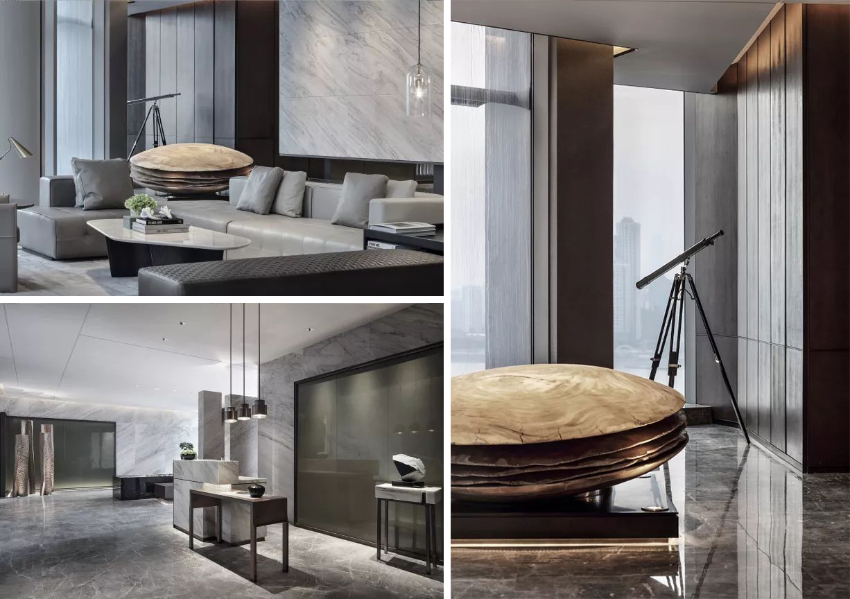 首層大堂空間對於這座636米的長江江畔地標來說,更像是一部史詩的開篇,設計對於東西方居住理念的提煉從一開始便鋪陳顯現,將西方現代的“幕牆”與東方自古的“圍合”特點創新融合成“圍廳間築”的設計思路。
