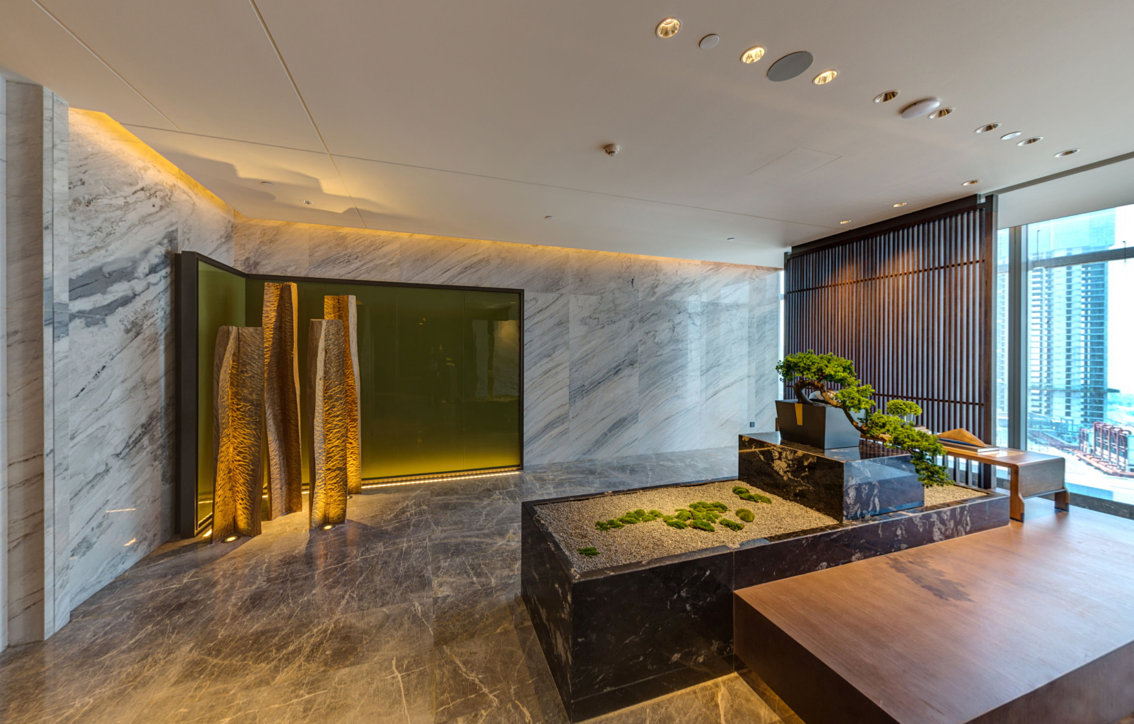 這些融入東方傳統圍合住居韻味的元素被有機地安排在步入大堂的流線之上,令長江天塹與聳立入雲的現代建築消融了冷俊與淩厲,讓室內建築空間與景觀的聯繫也生動起來。