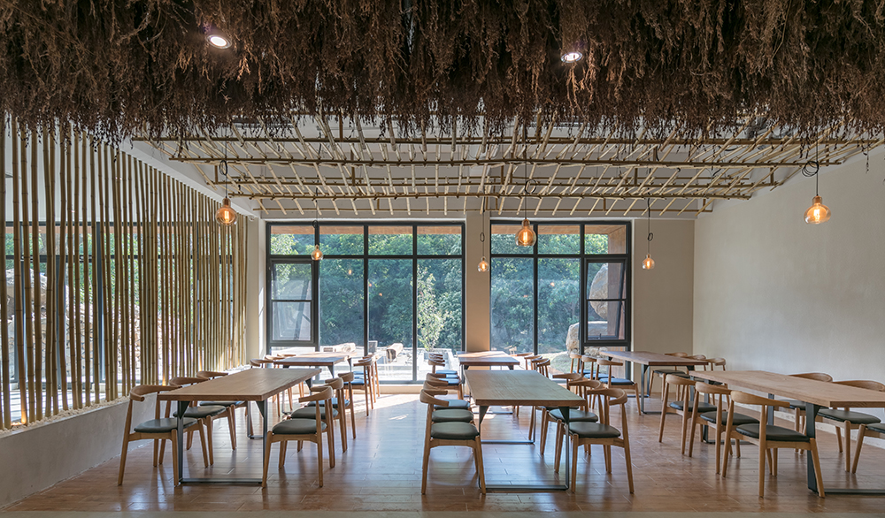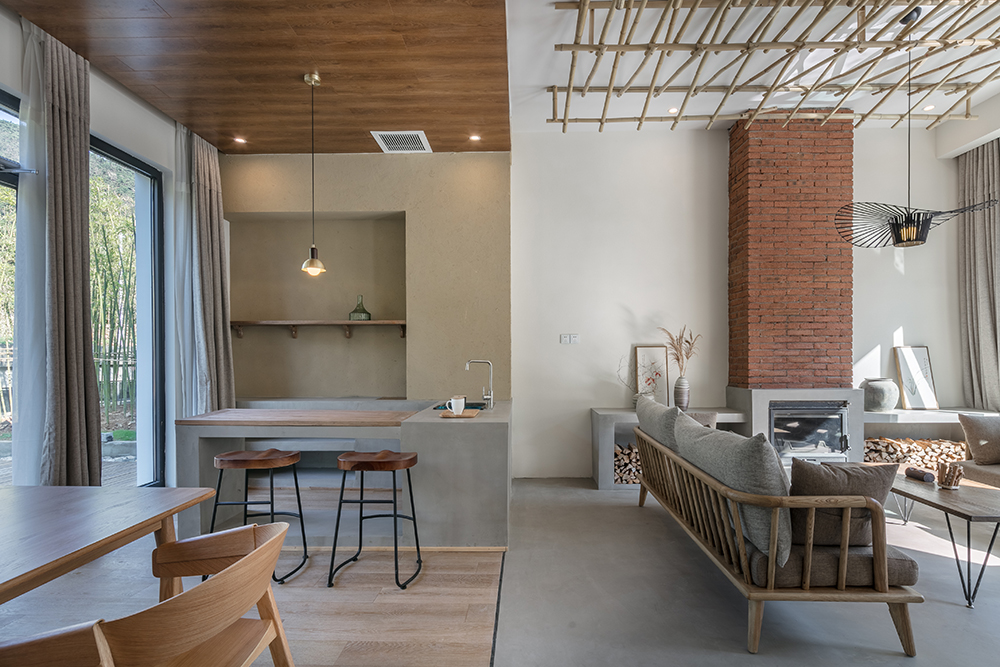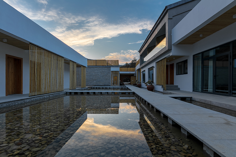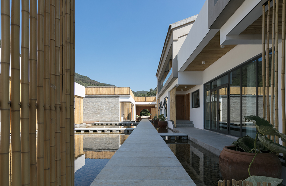 With the help of the terrain height difference, the side close to the golden line river is designed as a guest room on the first floor, the restaurant and basement are below the guest room, and the loft guest room on the inner side is designed as a two-story guest room, which ensures that all 12 rooms have a better landscape view. The outer facade along the road adopts the same strip stone as the mountain house, and the appearance is consistent with the surrounding residential houses. The inner yard adopts a relatively relaxed white wall, decorated with bamboo. At the same time, the mountain spring water is introduced into the inner yard, which makes the inner yard into a smart and modern water yard, forming a completely different living experience from the mountain house.