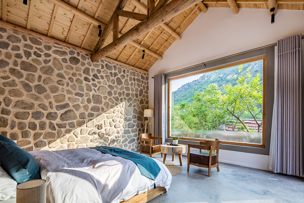 The building materials are mainly local stones. The external facade adopts the strip stones commonly used in local folk houses, the internal wall adopts pebbles, and the roof is the herringbone roof of traditional folk houses. After the civil construction is completed, the pebbles and roof are the indoor effect, which is not only environmental protection, but also reduces the cost.