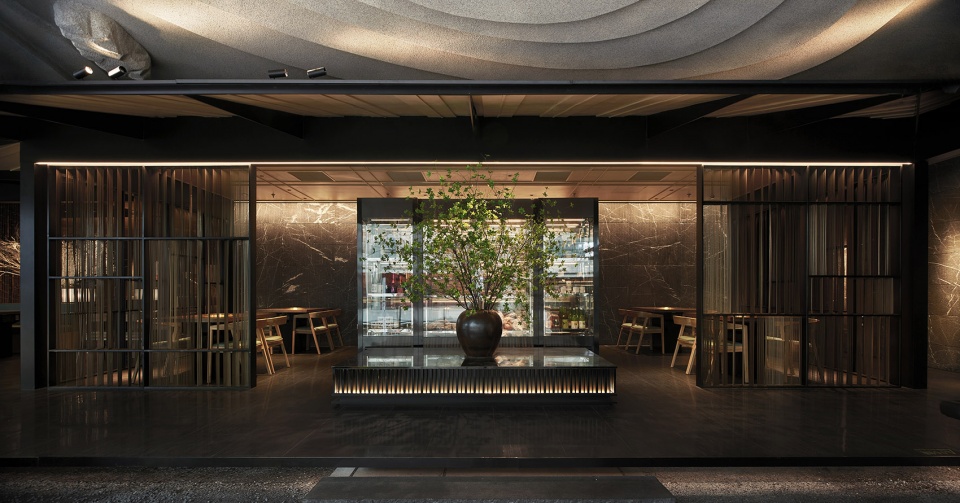 The black figure grooved stone wall is embellished with copper grille to enhance the sense of reality. Through the copper grille, the evenly distributed lines disperse the soft light from the surrounding landscape and lanterns, presenting a hazy and picturesque visual effect that making the space more layered and have artistic concept. The “semi-outdoor” dining area under the eaves is divided from the mall corridor by the landscape cleverly.