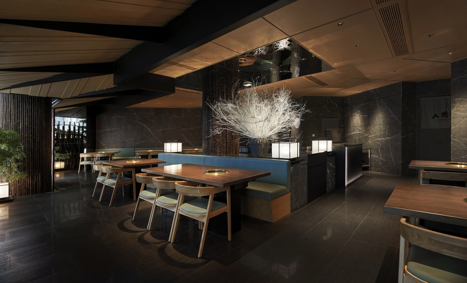 The restaurant is located at Shanghai Hang Lung Plaza, which is a busy shopping area in Shanghai. The design of the restaurant is based on deep black color, integrating the concept of “nokishitakuukan” in traditional Japanese architecture and gardening into the interior. By using landscape scenery and simple spatial aesthetics, the designer create a cozy and comfortable dining atmosphere in a modern downtown, creating a unique modern dining space with traditional elements.