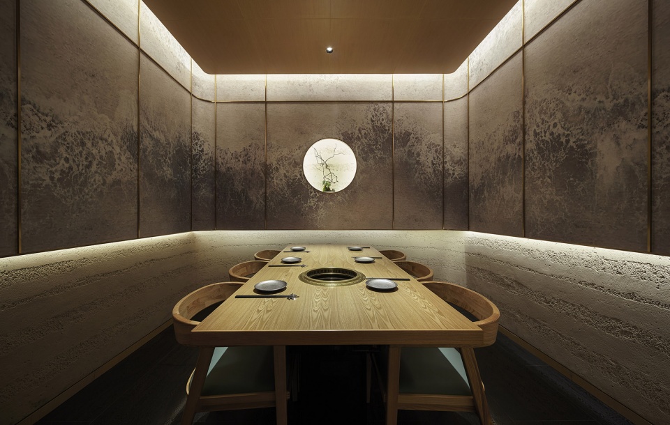 可容纳12人就餐的榻榻米包间采用了与公区截然不同的温暖基调,整体氛围温暖舒适。传统的和室夯土材料、竹编与木料搭配暖黄色的灯光,地面温软的榻榻米材质,触摸之中使客人放下内心对陌生环境的芥蒂。顶级和牛在炭火高温炙烤下发出滋滋的声音,细嗅慢品,享受视觉味觉听觉的多重满足。半透明的和纸移门可根据不同的用餐需求,将12人包间分割为8人间和4人间。利用富余的空间设置景观小品,打破墙面重复的造型,为空间增加趣味性与观赏性。