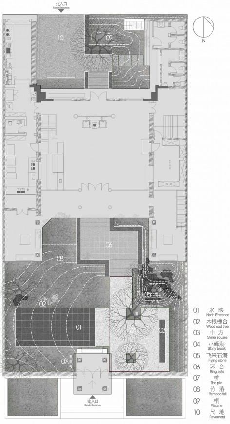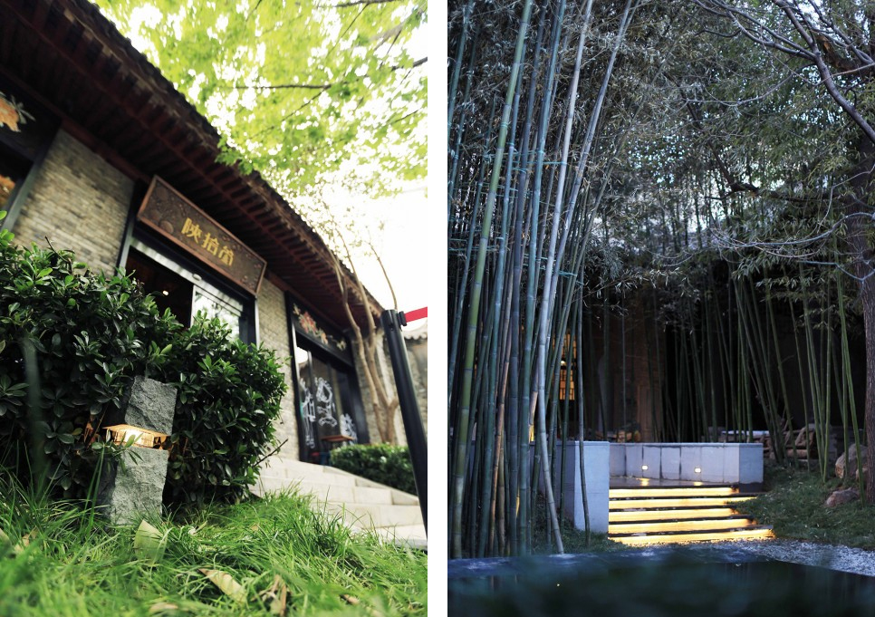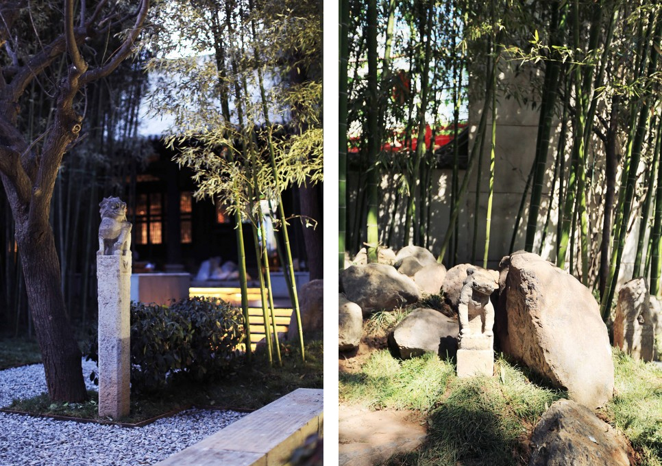 In this design, the memory of the site was kept to the maximum extent and the original bamboo forest was completely retained; one scholar tree, one tung tree, one willow and the stone became the key points of protection; tables and chairs made of scholar tree roots , hitching post and the original stepping stones became an expression of the courtyard in spirit and culture level.