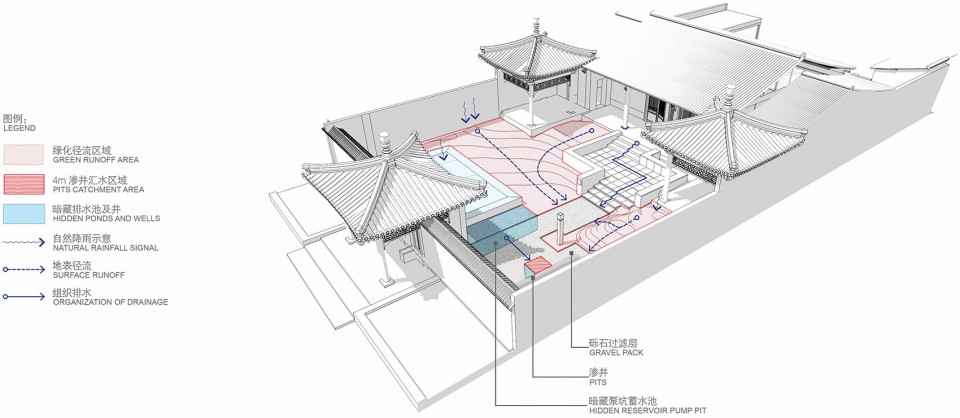 院内现状为老院落,无排水管网成为设计的难点。设计采用传统古村落的排水设计手法,使用最环保的方式打通自然的雨水通道,与土地进行对话。