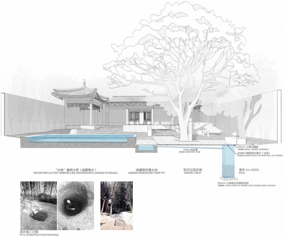 The specific methods were to dig a 4-meter seepage well at the gravel pavement in courtyard, and then both rainwater and water from waterscape would flow into the place with gravel pavement in the way of surface runoff; next, after filtration, the water would be discharged into seepage well, which effectively solve the problem of drainage within the site.