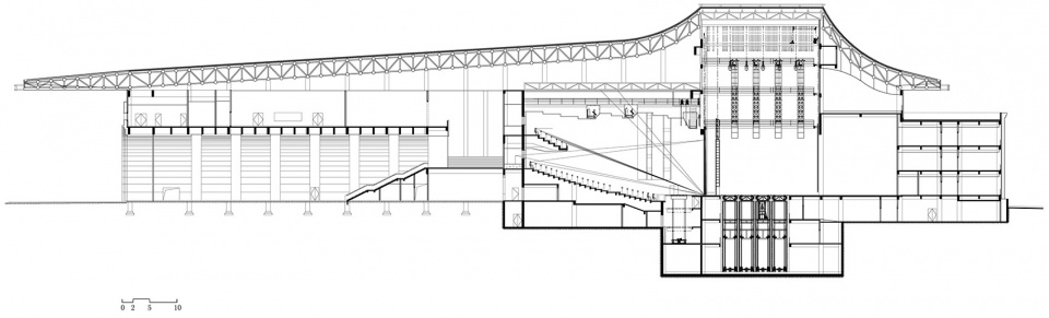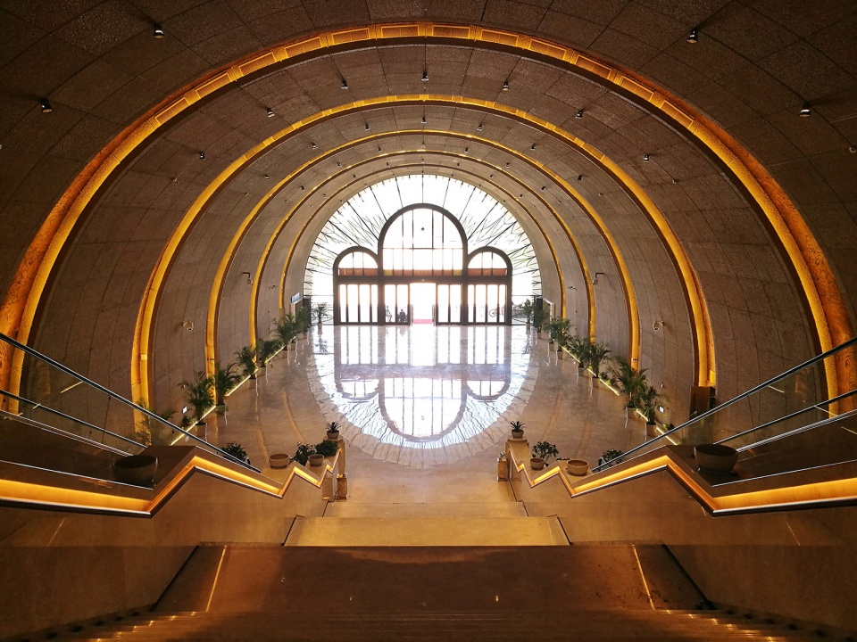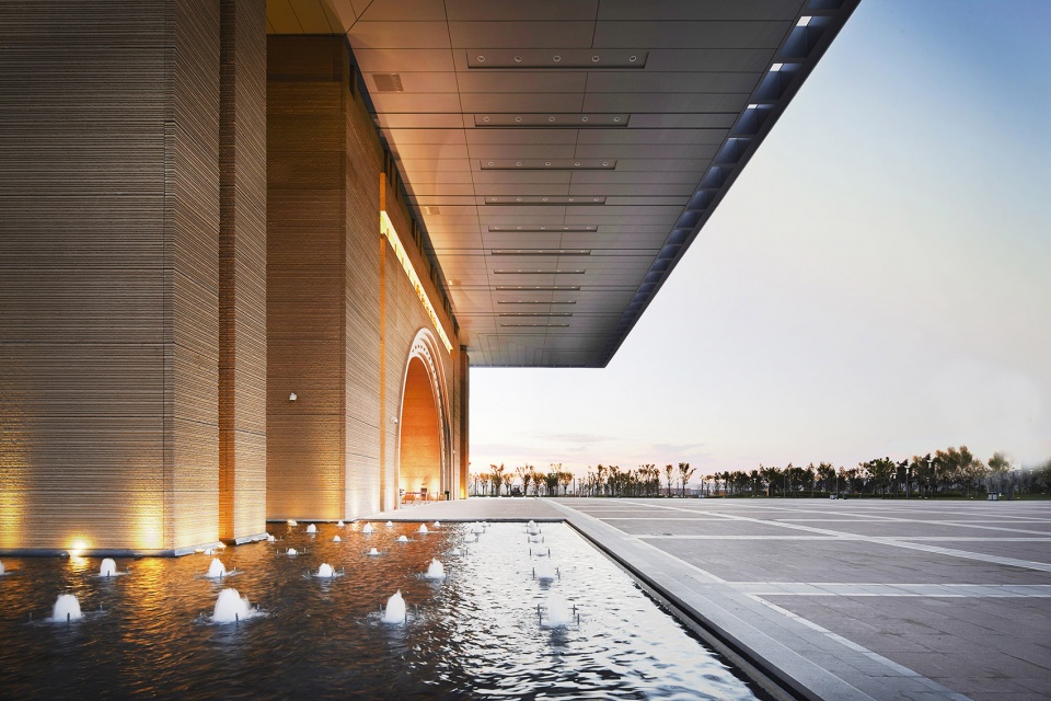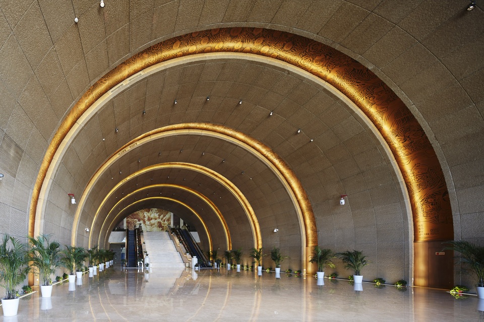 The core public space of the Grand Theater is the Public hall constituted by 7 big arches. From perspective of function, it connects three halls of the theater and rationally organized various streamlines and functions; In space, as the continuation of the big arch of the main entrance, it creates a sensational feeling woithout too many artificial decorations.