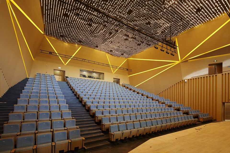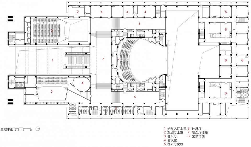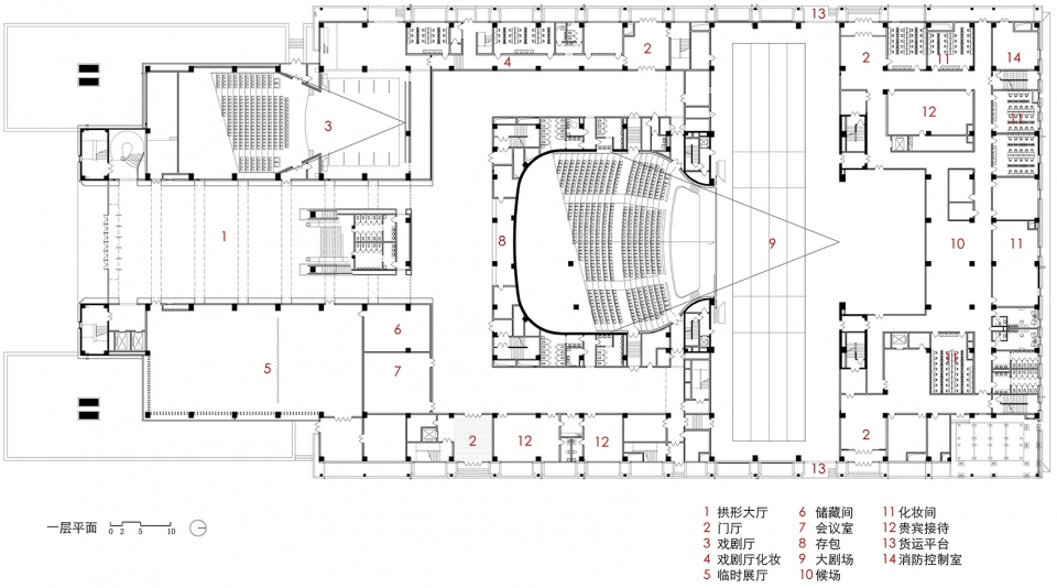 大剧院的核心公共空间是七道大拱组成的公共大厅,在功能上承接起剧场三大厅,并合理组织各个流线及功能;在空间上,作为主入口的大拱门的延续,其不需要太多人工装饰,便产生令人震撼的感觉。