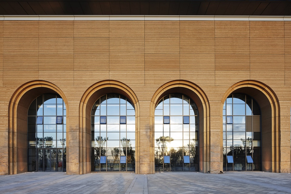 建筑外立面材质主要应用艺术混凝土、玻璃、金属三种材质:艺术混凝土的有着黄土大地的熟悉的味道,肌理贴近自然,如同沟壑,使建筑如从大地中生长出来,屋顶的造型感更加强烈,增添现代开放气息,且通过玻璃幕墙的衔接,屋顶也更加轻盈。