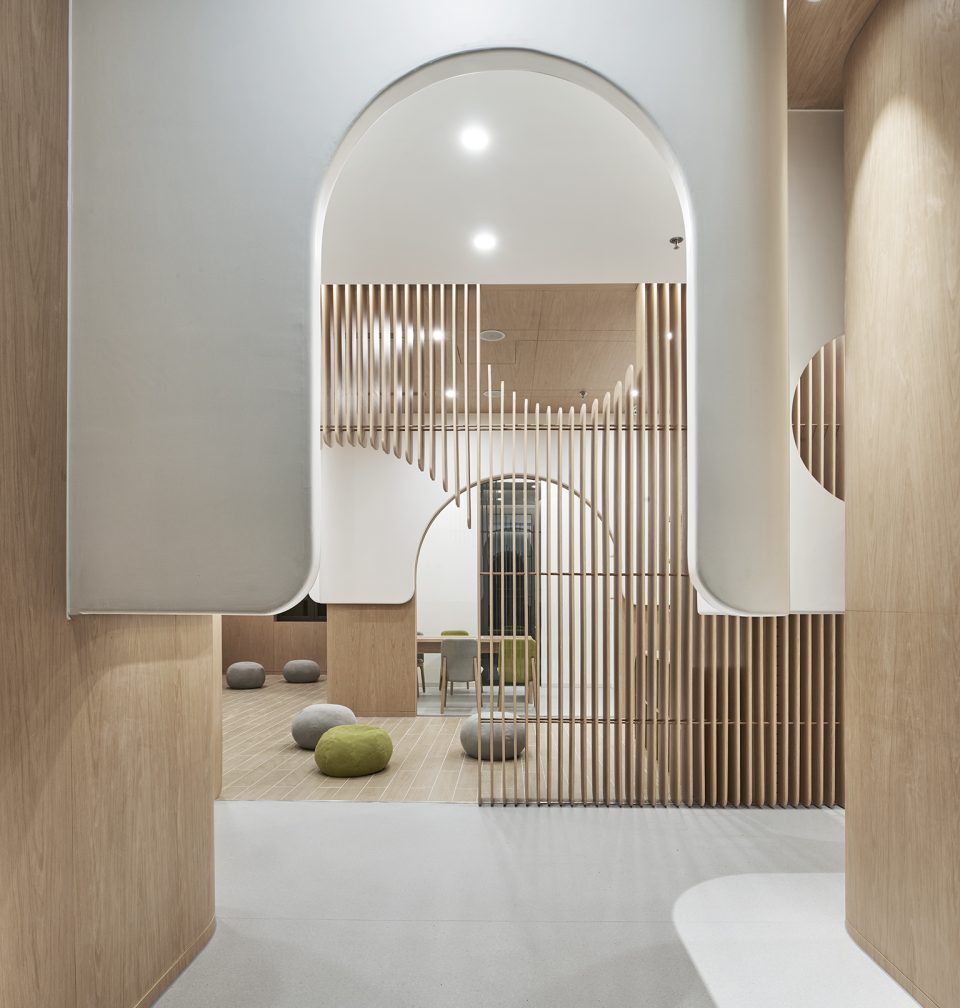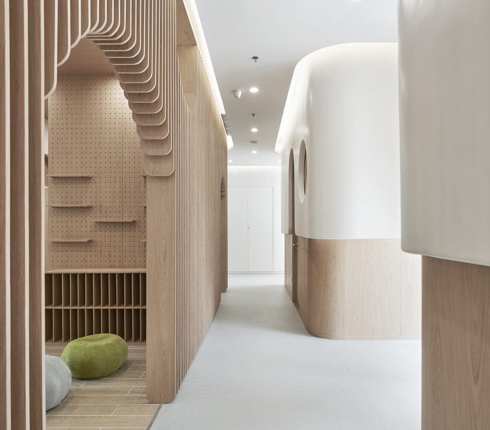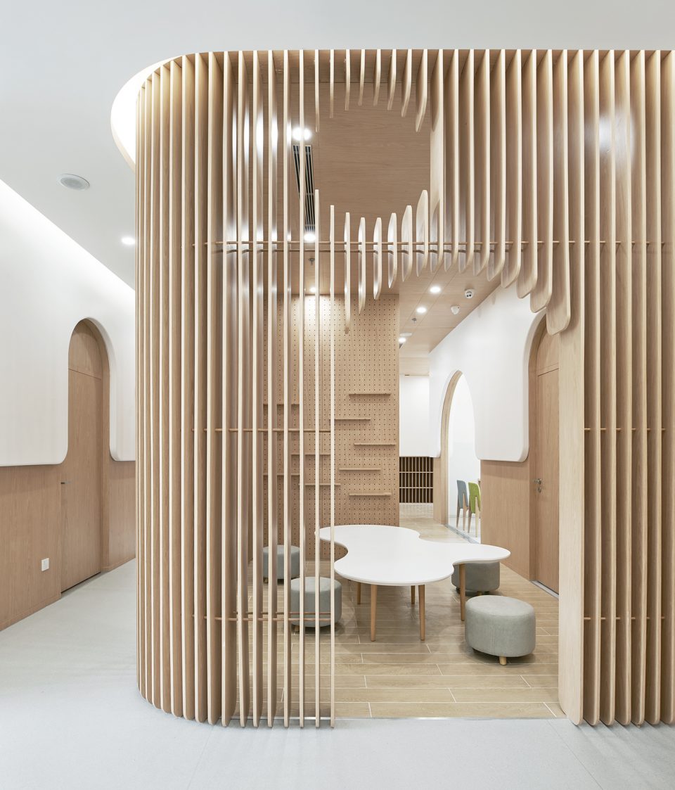 The main material of the space is curved wood, creating a warm and natural atmosphere while intervening in children’s scale. An overall space atmosphere is formed by putting in a white continuous suspended curved wall, wrapping the enclosed space, blurring the boundary between independence and opening. The change of the curved wall in the space and the handling of the openings form multiple open and semi-open spaces. The changing wall combined with the facade windows blur the spatial relationship between indoor and outdoor, forming a variety of spatial types and creating an open, free and natural teaching environment.
