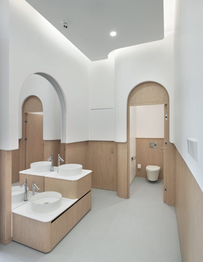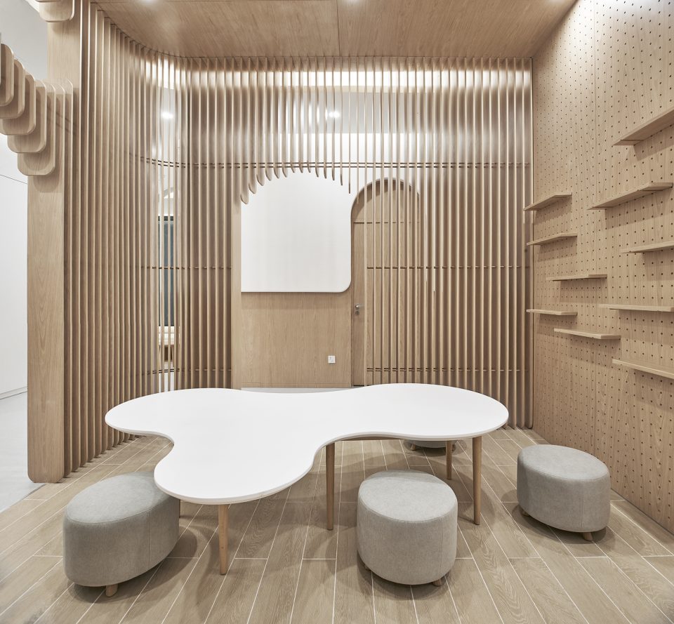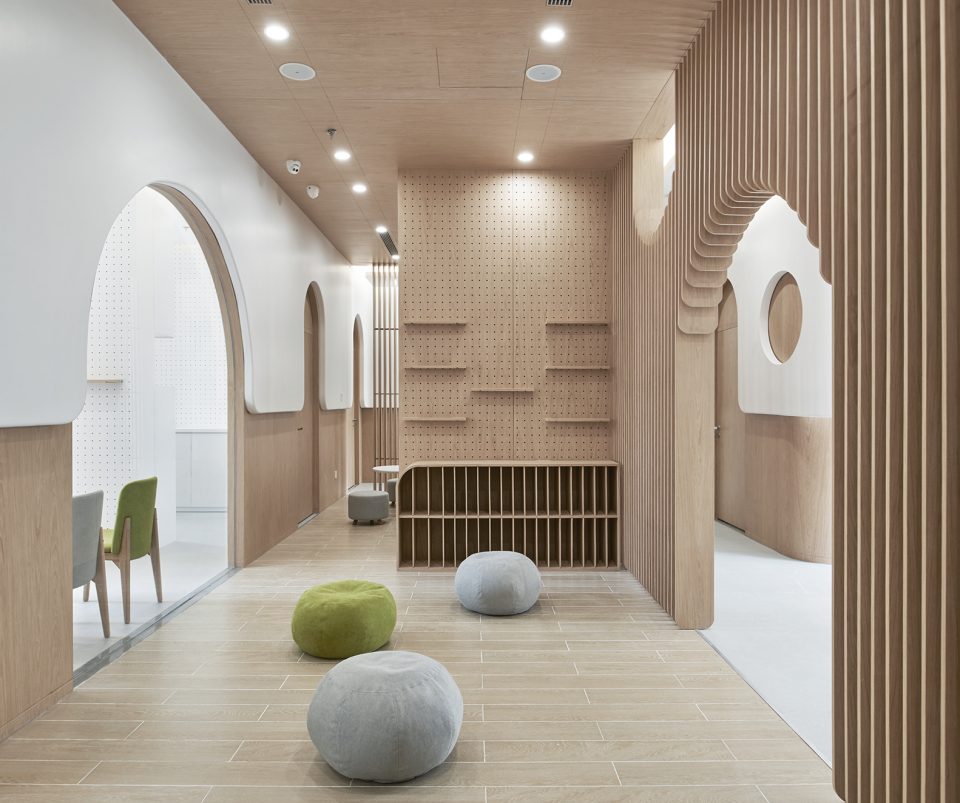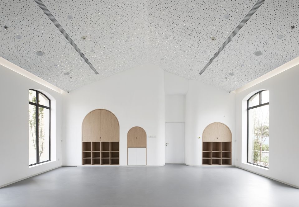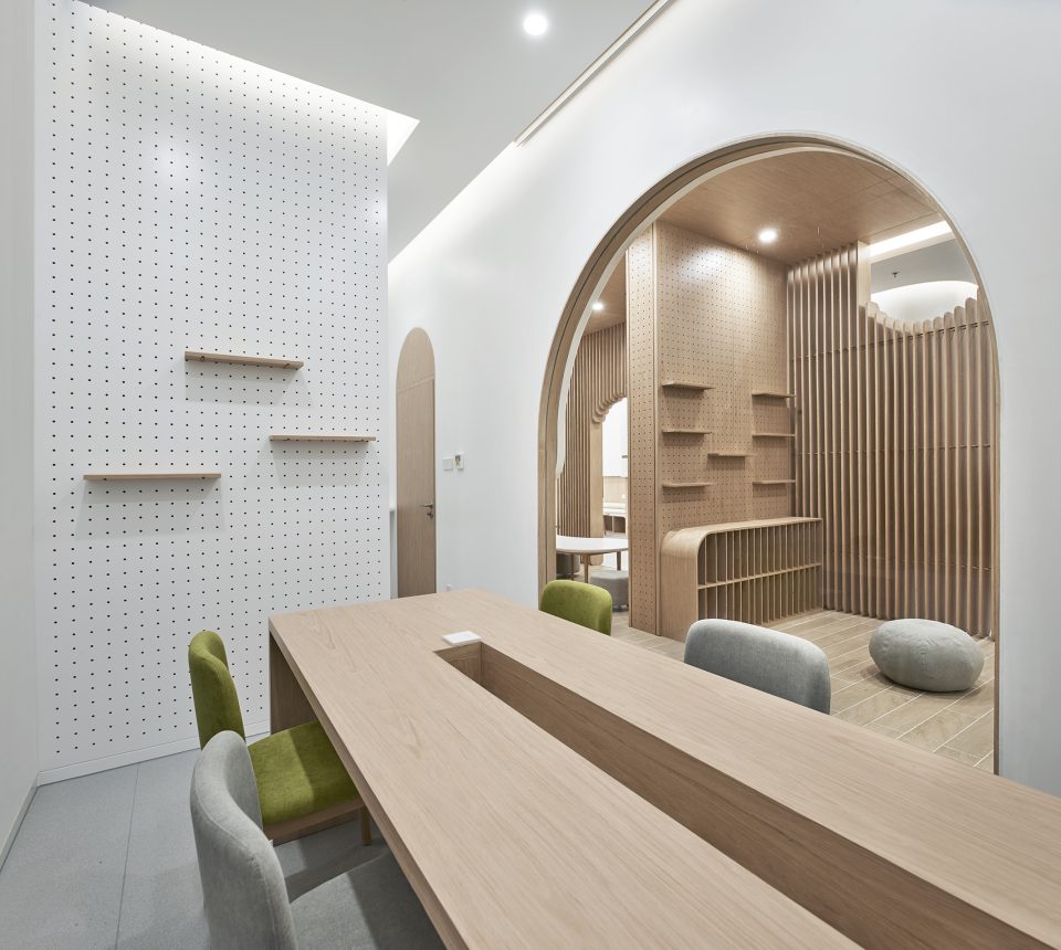 The main material of the space is curved wood, creating a warm and natural atmosphere while intervening in children’s scale. An overall space atmosphere is formed by putting in a white continuous suspended curved wall, wrapping the enclosed space, blurring the boundary between independence and opening. The change of the curved wall in the space and the handling of the openings form multiple open and semi-open spaces. The changing wall combined with the facade windows blur the spatial relationship between indoor and outdoor, forming a variety of spatial types and creating an open, free and natural teaching environment.