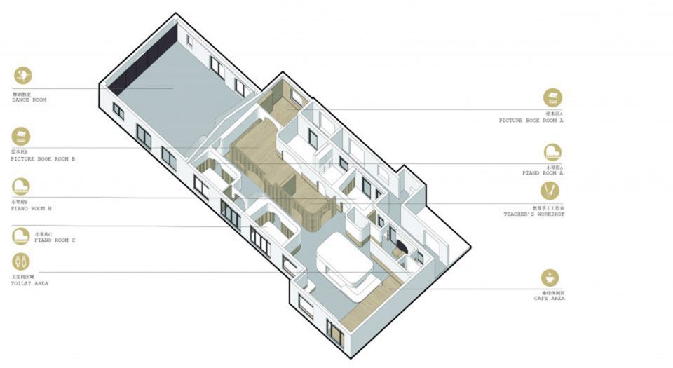 Aranya Children’s art classroom is designed by odd, which creates a children’s music art space that integrates music, singing, dance performances, art work, and picture books. It contains a casual dining area, three separate piano rooms, a picture book area, and a comprehensive dance studio.