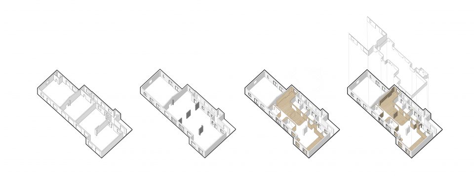 空间主要材质为弧形木材,营造温暖、自然的氛围,同时介入儿童的尺度,置入白色连续的悬吊弧形墙体,包裹独立封闭的空间,模糊独立与开放的界限,形成整体的空间氛围。曲线吊墙在空间中的变化和洞口的处理,形成多个开放与半开放的空间。变化的吊墙结合立面窗户,模糊室内与室外的空间关系。形成多变的空间类型,营造开放、自由、自然的教学环境。