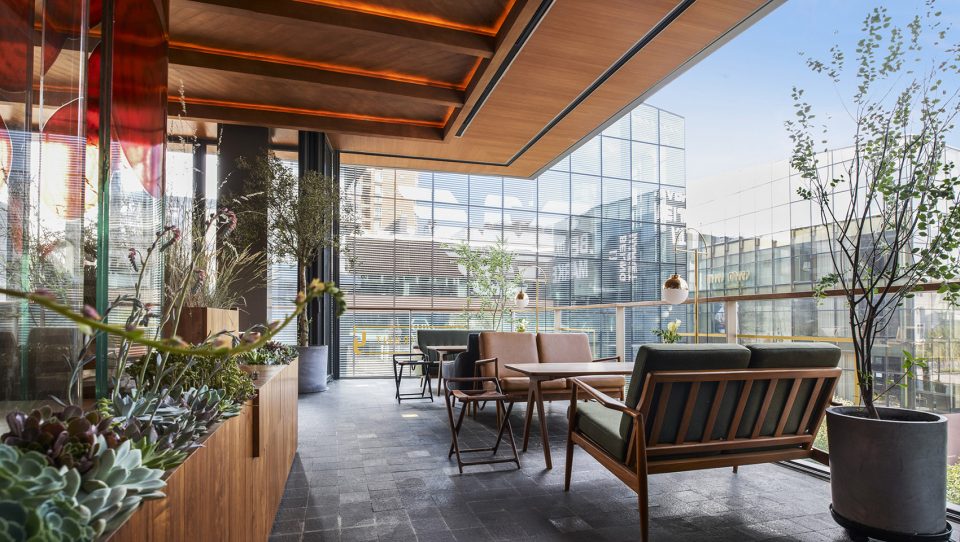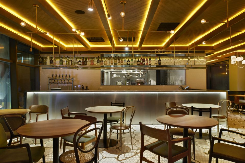 餐厅的就餐区一半室内,一半露台。室内的西侧开放厨房超长的多功能吧台,以及东侧与玻璃幕墙平行的咖啡吧台,拉丝不锈钢材质与周围融为一体,多功能吧台上方极简但不冷峻的吊架,及其食物、酒水与厨具的展示,都会让客人与餐厅在不自觉间交流。客人就餐时看着大厨们在布满六角小瓷砖墙面厨房有条不紊的忙碌,也不失为绝佳的就餐体验。