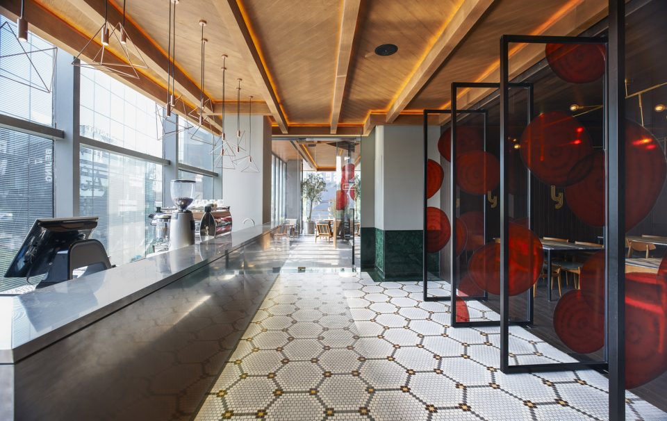 Half of the dining area is indoor and the other half is terrace. The west side of the indoor has a long multi-functional bar for the open kitchen, meanwhile there is a coffee & bar which is paralleled with a glass curtain wall in the east side. Stainless steel material integrates with the surrounding. The food, wine bottle and kitchen ware displays on the simple but not cold stainless steel suspended shelf allow customers and the restaurant to have unconscious communication. Customers could watch the chefs working professionally in the kitchen that has a wall covered with small hexagonal ceramic tiles. To some extent, it is also a great dining experience to see this.