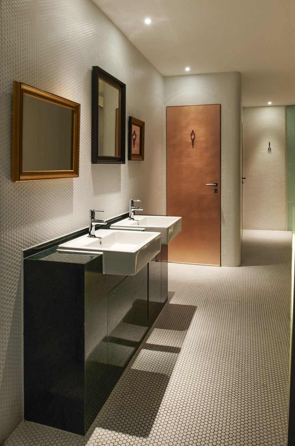 对于很多高档西餐厅来说,地面和墙面通常使用大理石材料,但太多的大理石会给人一种非常正式和拘束的空间感受。为了营造轻松的就餐气氛,设计师使用马赛克瓷砖,不规则的拼花图案给人以年轻、独特的就餐体验。
