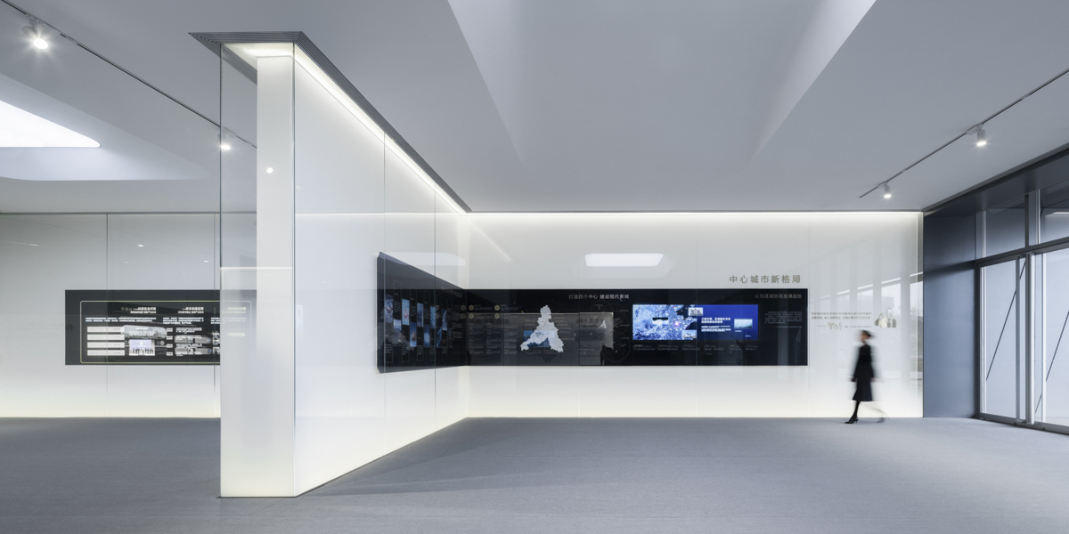 针对年轻观众,华润置地济南十六号展厅是anySCALE为华润置地设计的第二个展厅。矩形形状,具有前瞻性的设计具有两个平行的厚黑色玻璃墙,隐藏了原始场地难看的支撑梁。其中一堵墙设有一个现代且功能齐全的橱柜,“漂浮”在地板和天花板之间。
