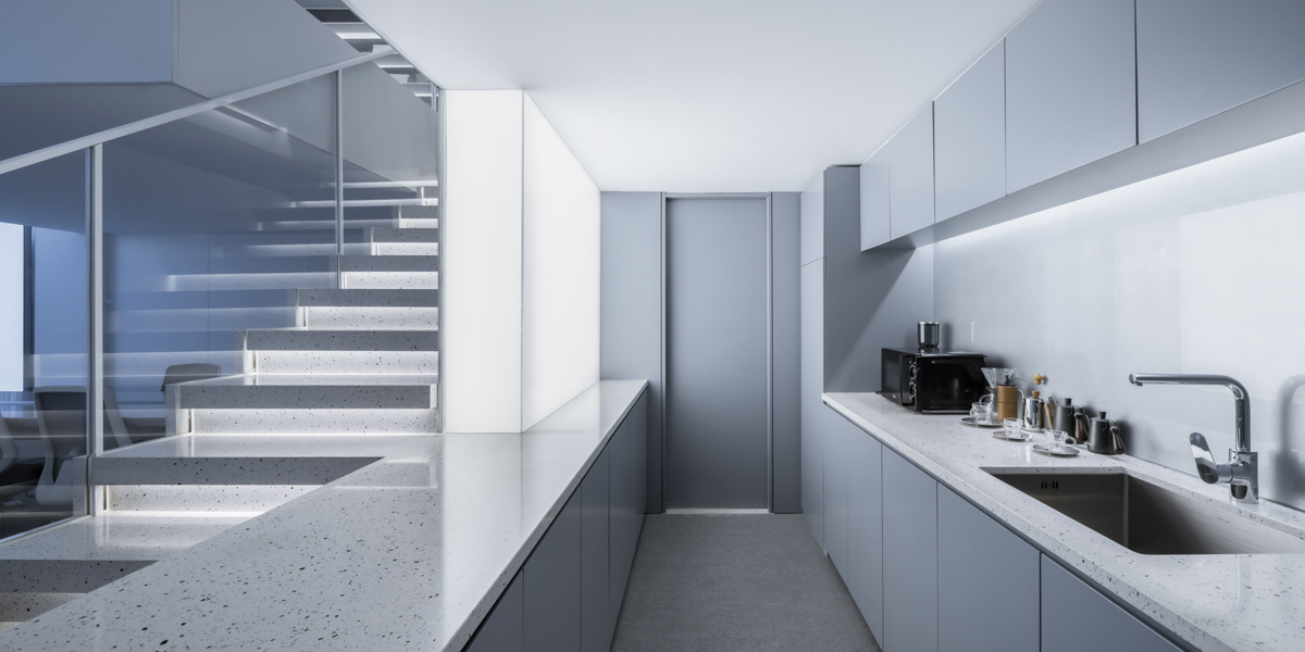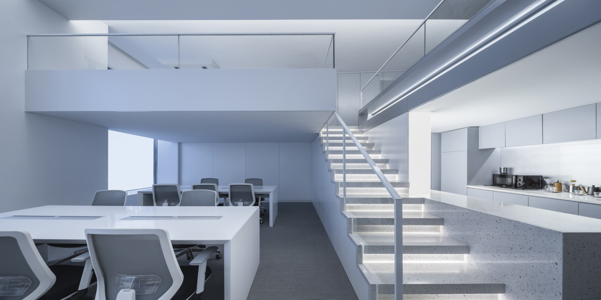 A minimalist ceiling design with artificial skylights provides warm "natural" white light, which works in tandem with the RGB-based color LED lighting system for special occasions. One corner of the space features a full-sized model of a loft office, a product display module with two floors. The loft's style follows a modern design approach to minimalism and functionality with a solid light beam structure on the ceiling that illuminates both sides—one of the project's most eye-catching features.