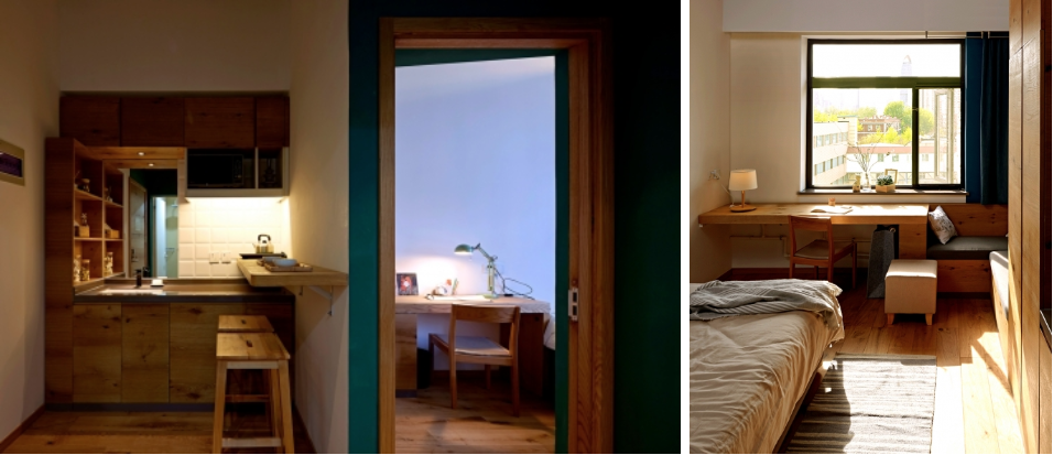 作为一个自由创造者的社群,我们希望提供各种有价值的机会和服务,因此位于三层的loffice为中型团队的入住提供了空间。每间使用面积达60-80平方米,可容纳12-18人自由办公。社区里的另一部分则是公寓空间。与其说是公寓,不如用“合租”去形容更为恰当,它包含有五层楼70间房,总共约2 500平方米的空间。建筑师为其设计了一间可容纳几十人的大客厅,并配置了从嵌入式烤箱、消毒柜到炒菜机器人一应俱全的开放式大厨房,希望这70个青年会像老友记或是生活大爆炸里的几位合租青年那样,每天能在一个大客厅里相互沟通、交流,一同分享、了解。