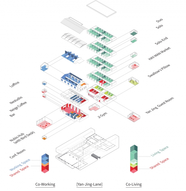 This big house is divided by static and dynamic, inside and outside: on the first floor are the large living room and gym shared with the offices, accompanied by a youth hostel, in order to bring more flowing vitality to the “Yan Jing Lane” community; on the second floor and above are the exclusive spaces for friends sharing the flat, with a convenience store “HAYMANSHOP” exclusive to residents, in order to ensure privacy of users while maintaining vitality of the area.